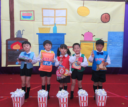 13日(土)、クリスマスお遊戯会。この日を心待ちにしていた子ども達。張り切って練習に励み、クリスマス飾りや小道具の製作もたくさん楽しみました。5歳児さんは、難しい動きやリズムをマスターし堂々と発表しました。ESS「No Popcorn」はみんなで意見を出し合い作り上げました。カール先生譲りのネイティブ英語も見事でした。 | ||