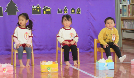 3・4歳児さんは、オペレッタの役になりきり「3匹のやぎのがらがらどん」を演じました。いちご組さんは衣装に着替えると、とっても嬉しそう!発表が終わると「はぁ~ドキドキした~」と満面の笑みでした。さくらんぼ組さんもお父さんやお母さんを見つけて指さしたり笑顔が出たり、音楽にノリノリで表現しました。 | ||