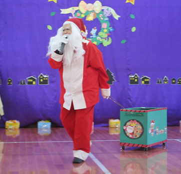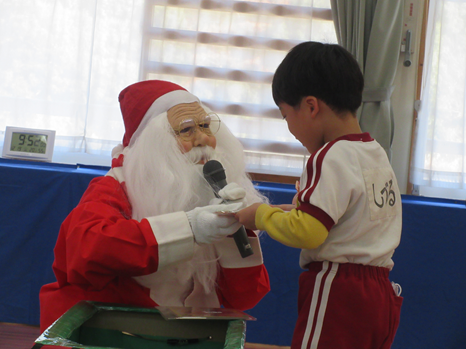 19日(金)、お誕生会&クリスマス会。司会進行の5歳児さんは一人一役、大きな声で進行しました。誕生者のお祝いとともに、一足早いクリスマスパーティー!2歳児のミニサンタさんが登場し「あわてんぼうのサンタクロース」を会場のみんなで踊って楽しみました。職員扮するサンタさんも登場!「メリークリスマス!」の声を聞き大喜び。一人一人にプレゼントを手渡され、超ご機嫌!「嬉しい」「楽しい」「美味しい」がたくさん詰まったクリスマス会でした。 | ||