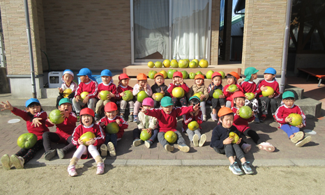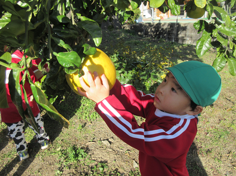 りんご組さん・いちご組さんが晩白柚を収穫しました。大きな実が鈴なり。数えてみると50個ほど。2年前、葉っぱに太陽の陽がいっぱい当たるように剪定した効果が現れました。両手で抱えるほどの晩白柚を持って大喜び。給食のデザートに添えられています。 | ||
