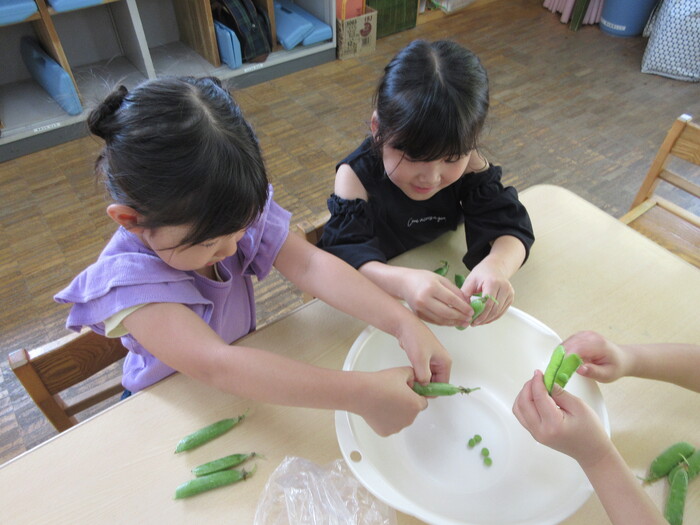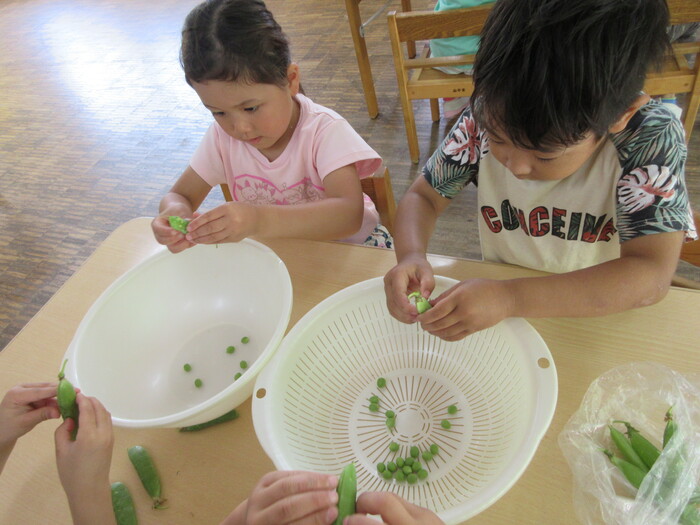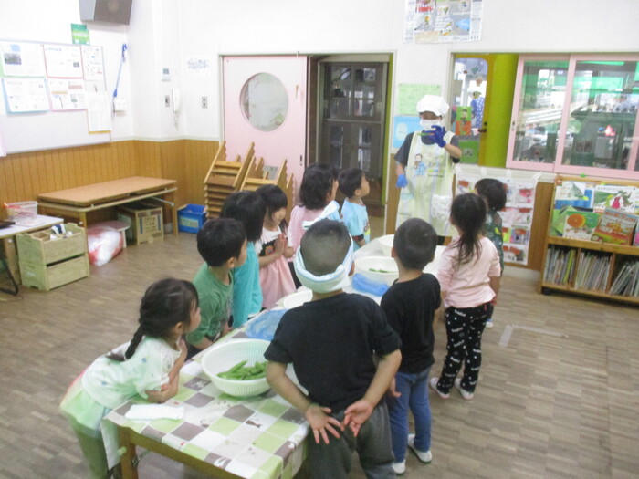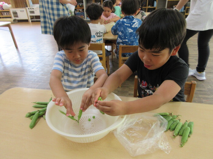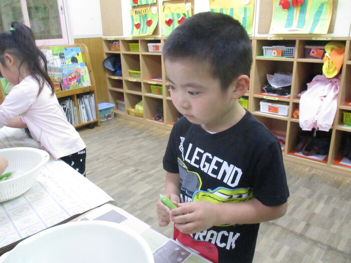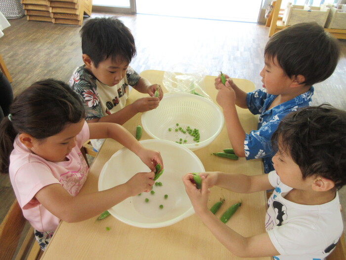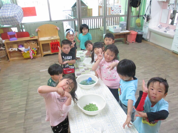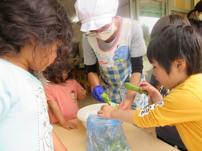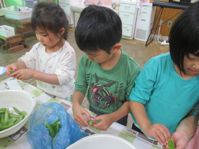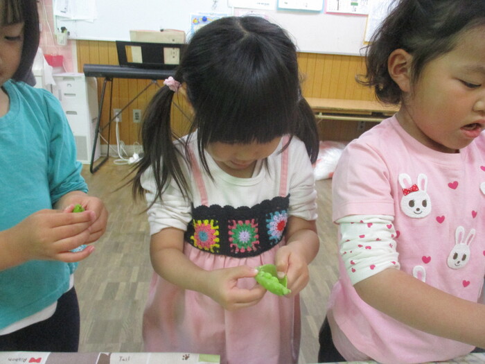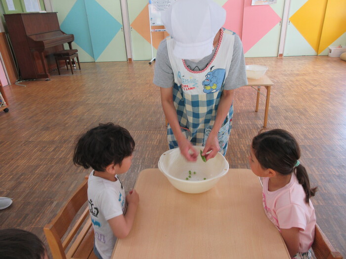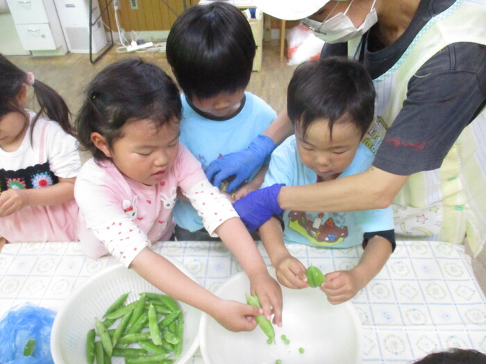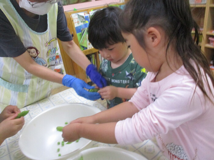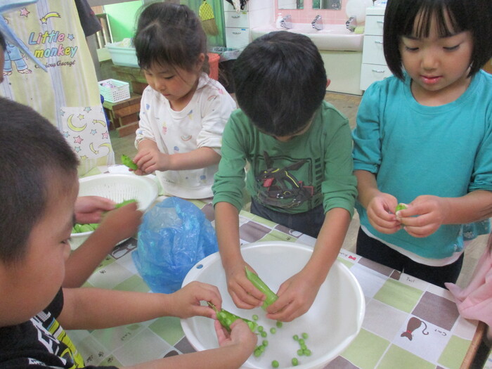 5月8日(水) 給食のお手伝い (グリーンピースのさや剥き) ~ りすぐみ ~ | ||