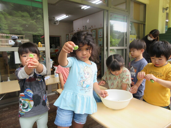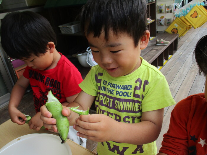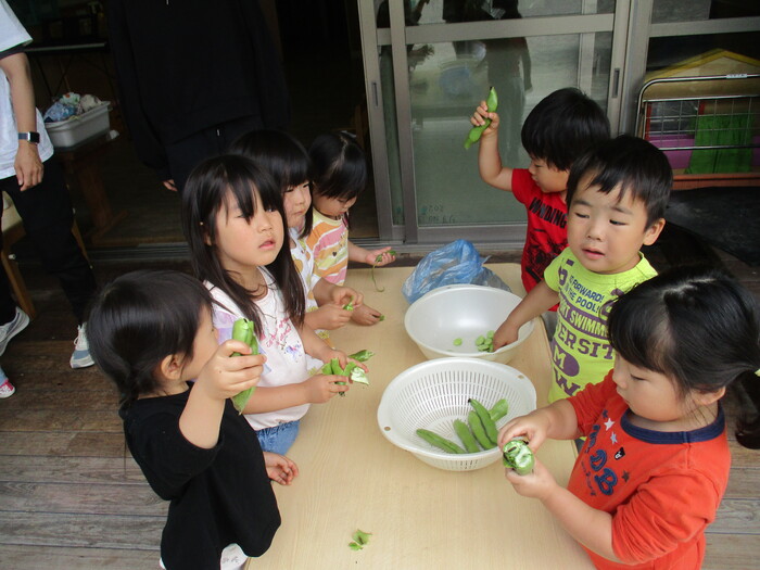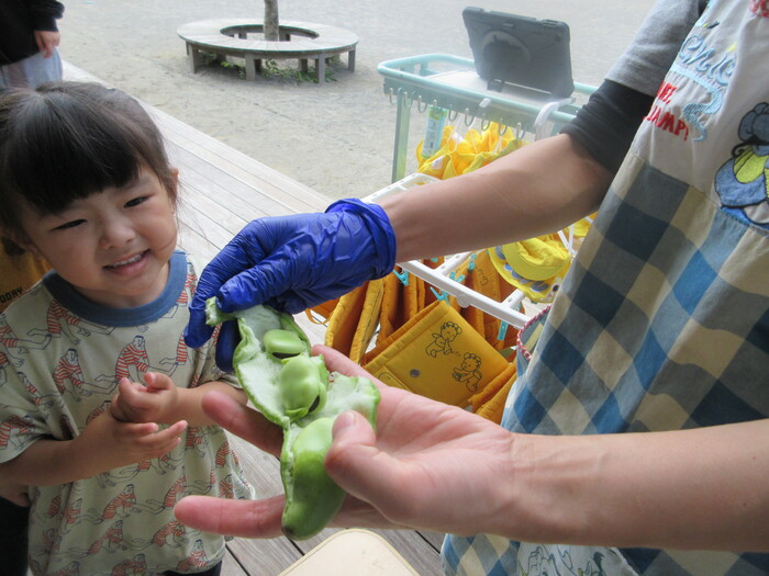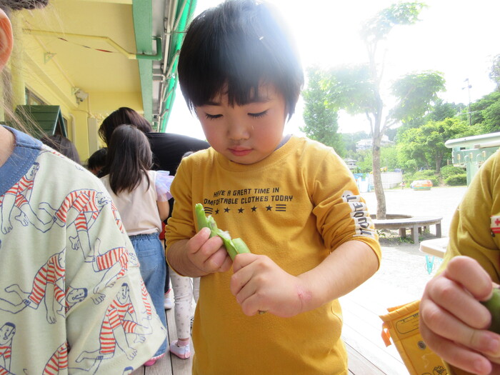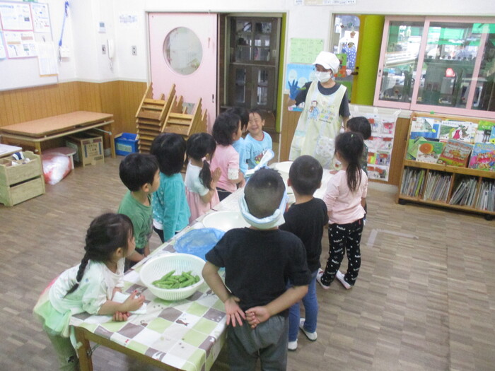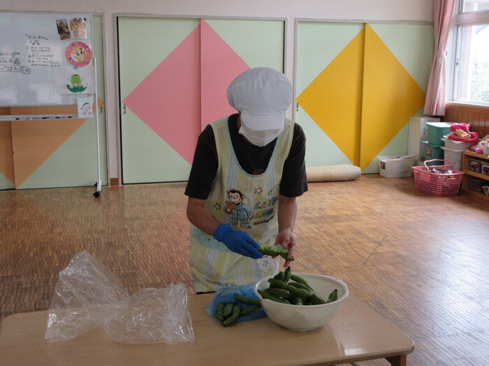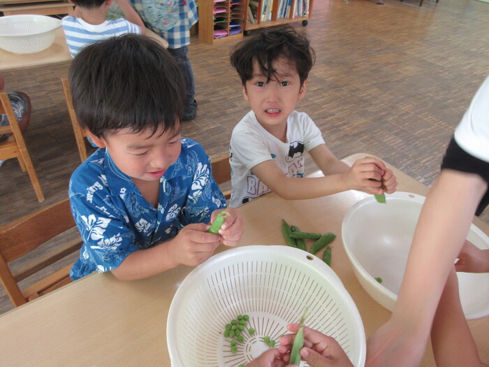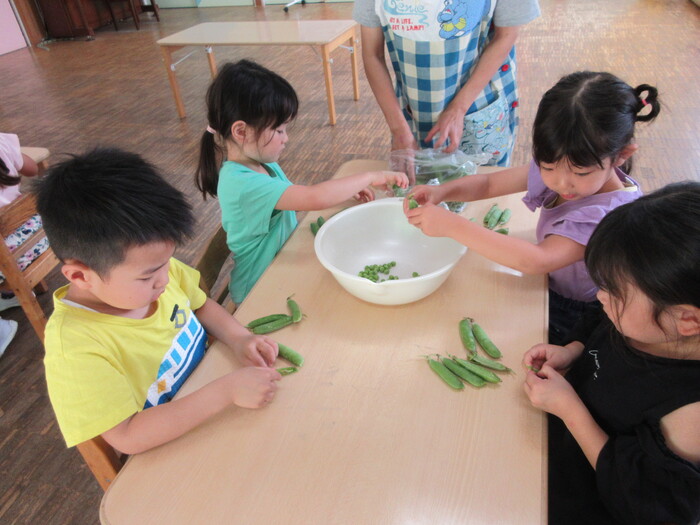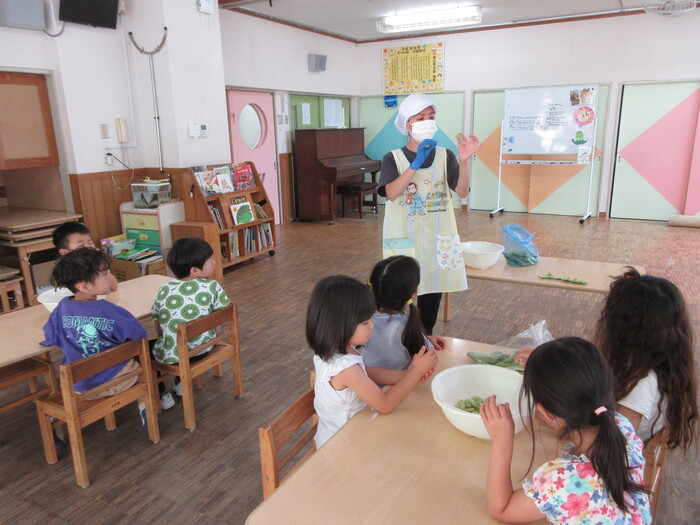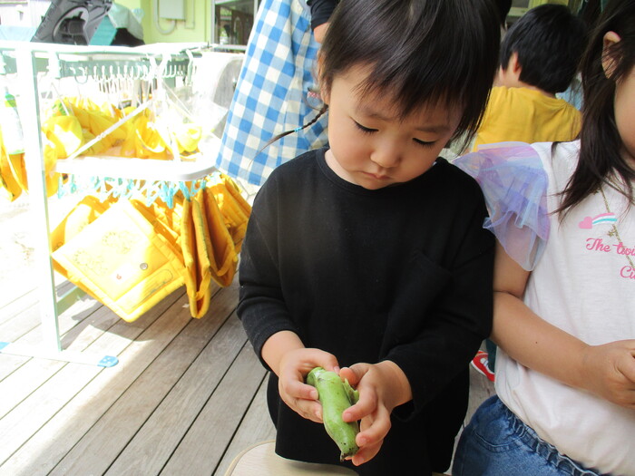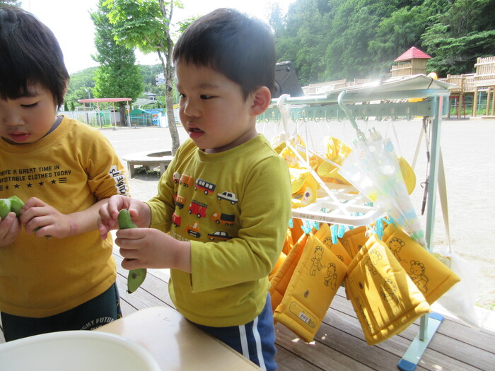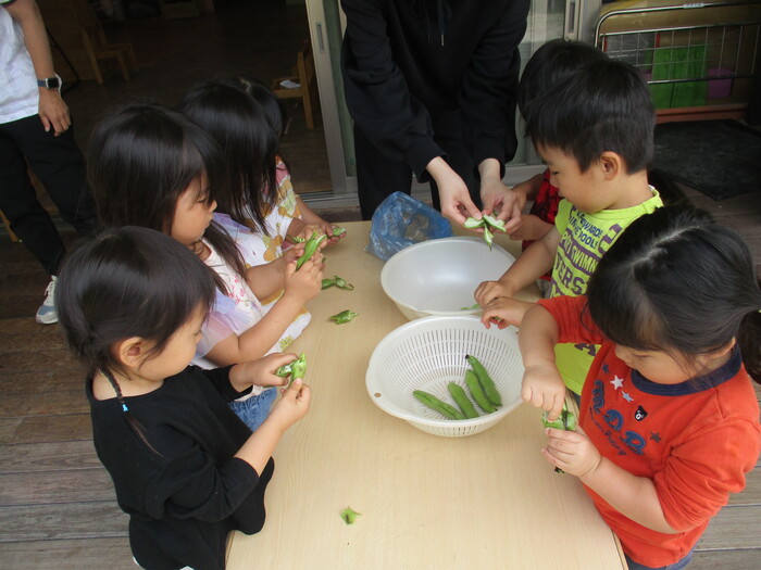 5月8日(水) 給食のお手伝い (グリーンピースのさや剥き) ~ りすぐみ ~ | ||