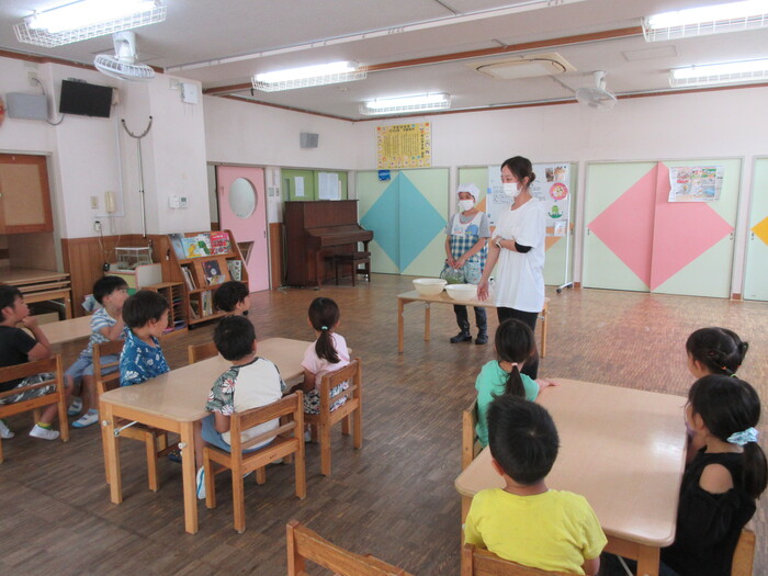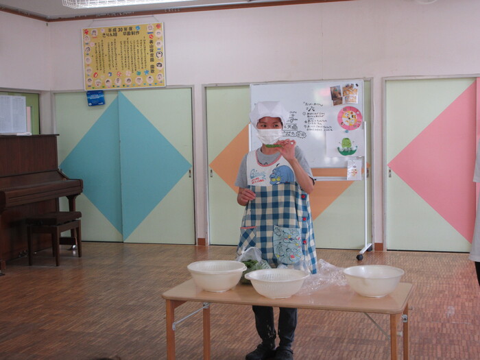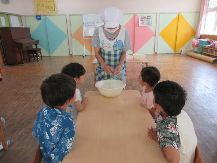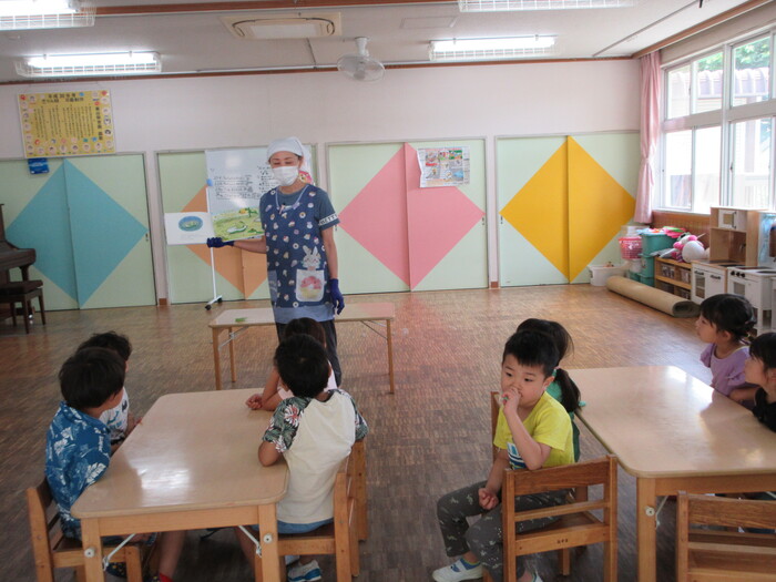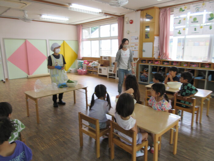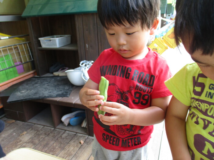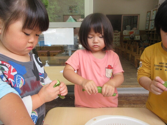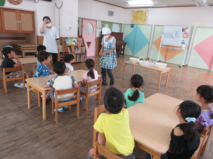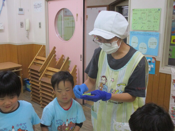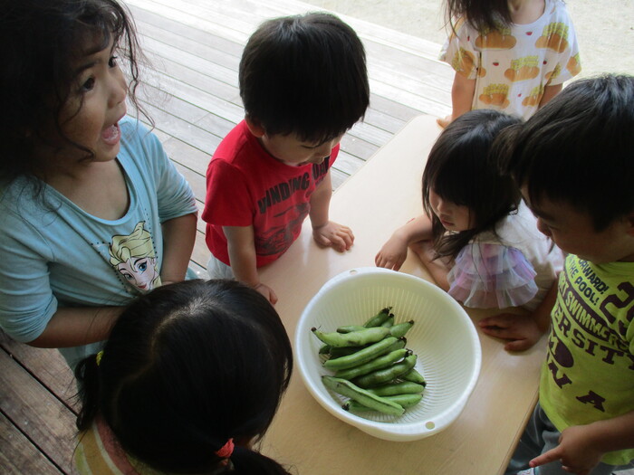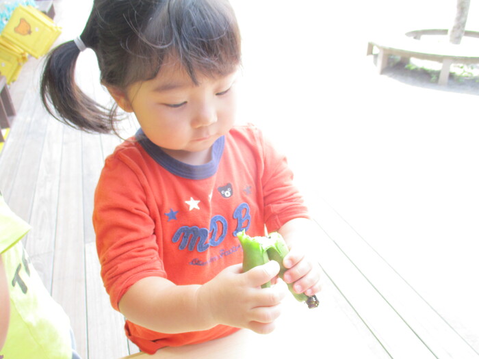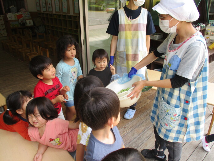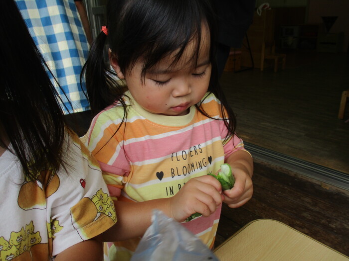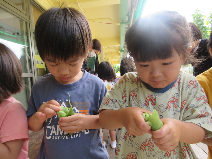 5月8日(水) 給食のお手伝い (グリーンピースのさや剥き) ~ りすぐみ ~ | ||
