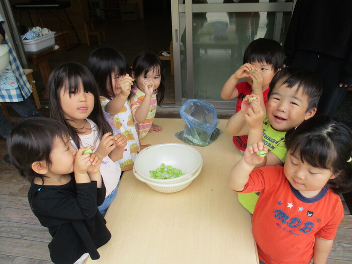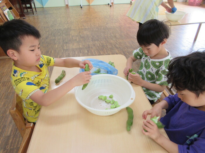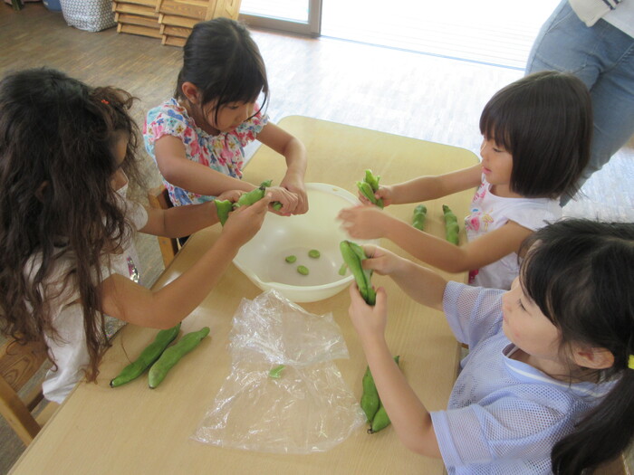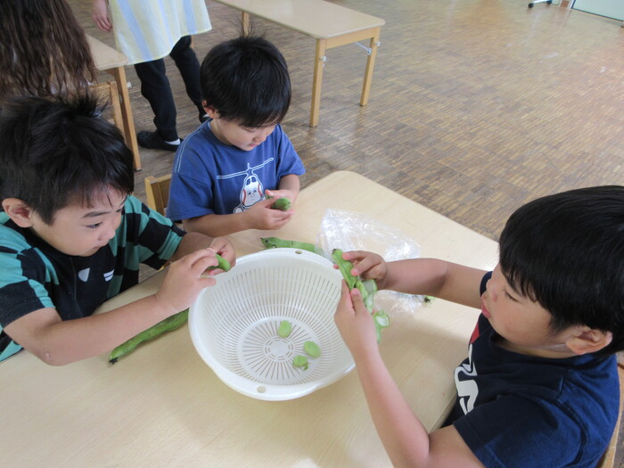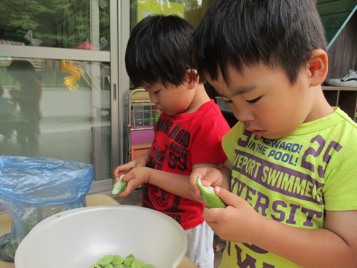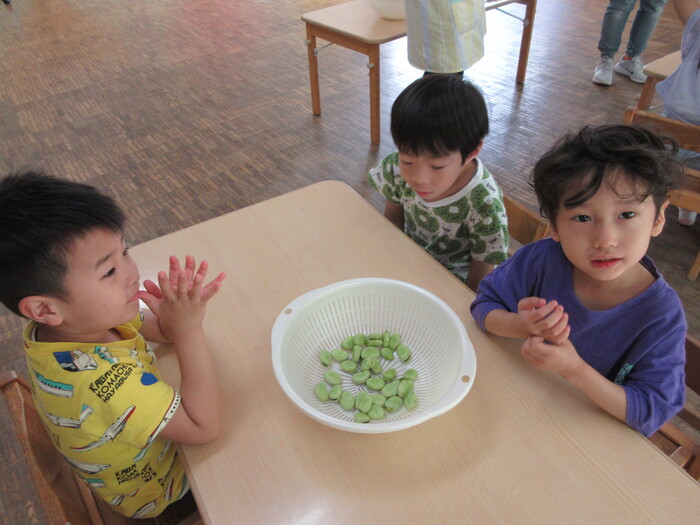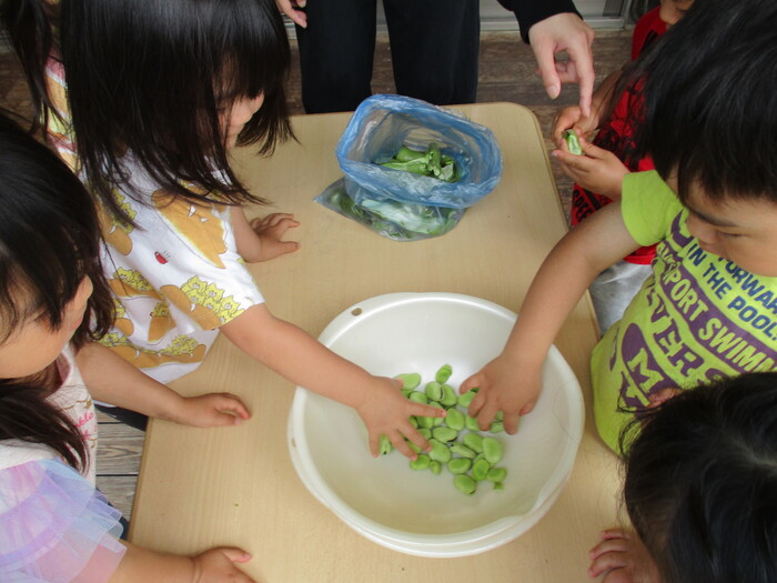 5月22日(水) 給食のお手伝い (そら豆のさや剥き) ~ きりんぐみ ~ | ||