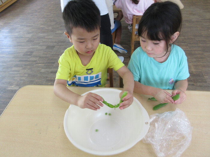 5月7日(火) 給食のお手伝い (グリーンピースのさや剥き) ~ うさぎぐみ ~ | ||