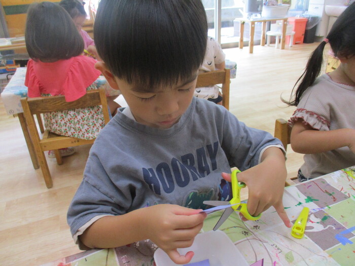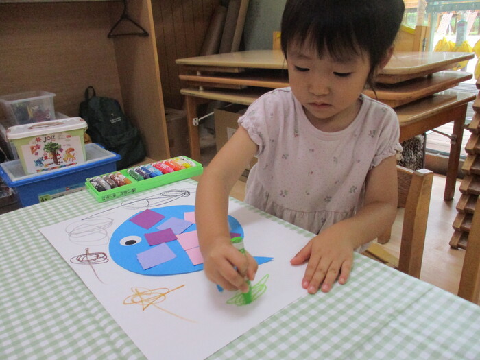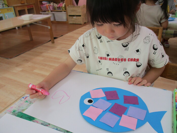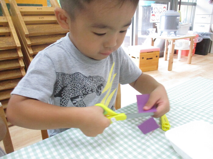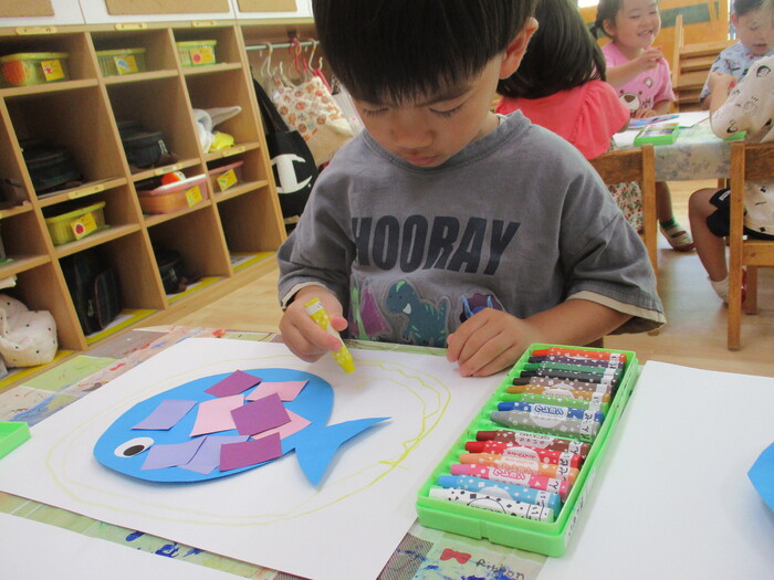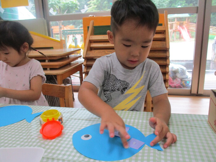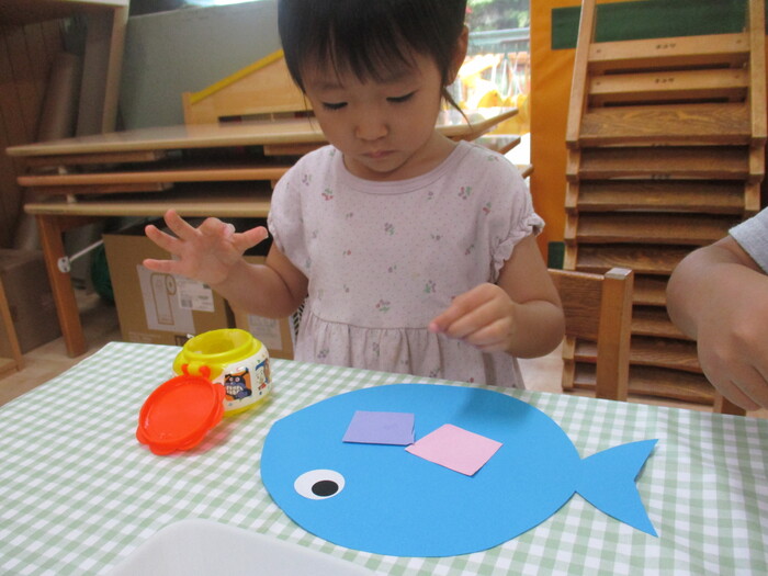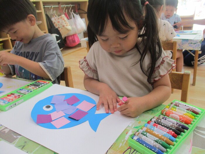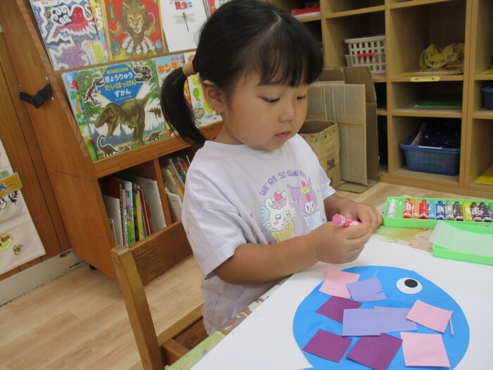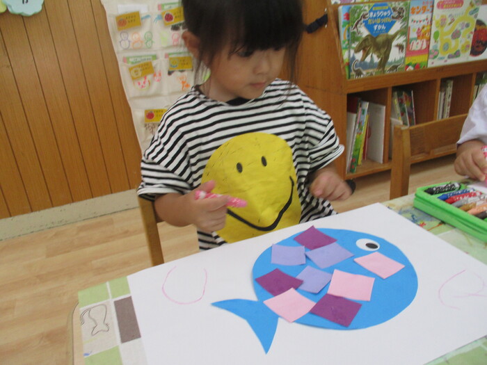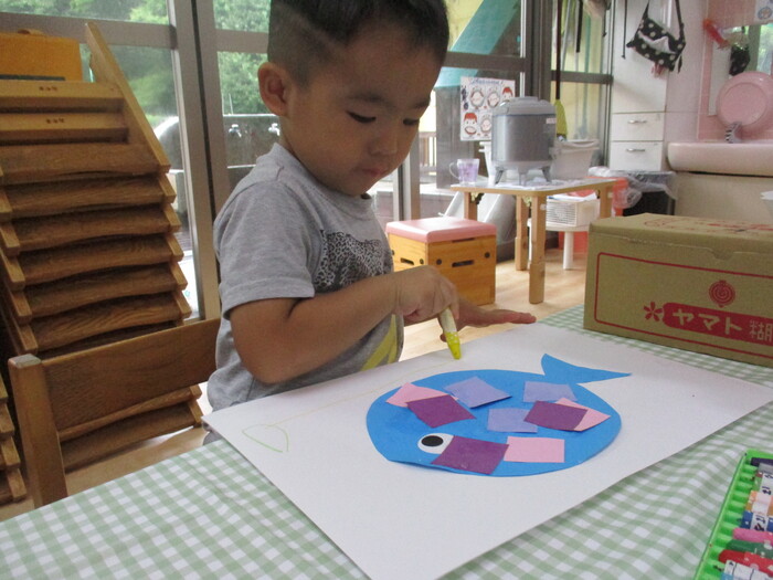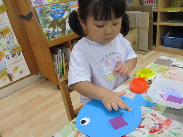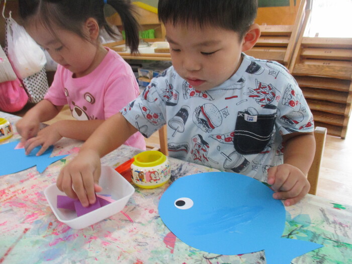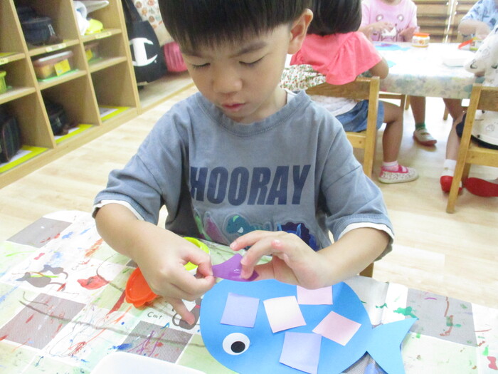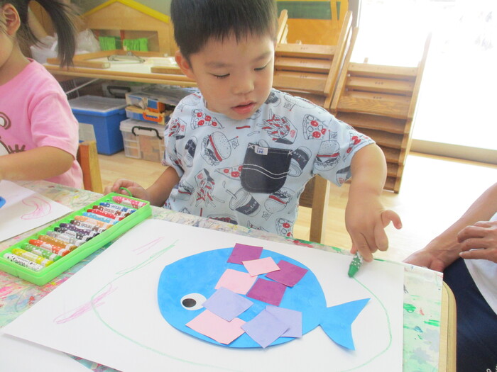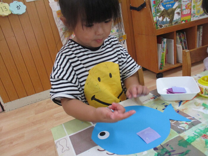 8月13日(火) 制作活動「おさかな」 (はさみ&のりの練習) ~ りすぐみ ~ | ||
