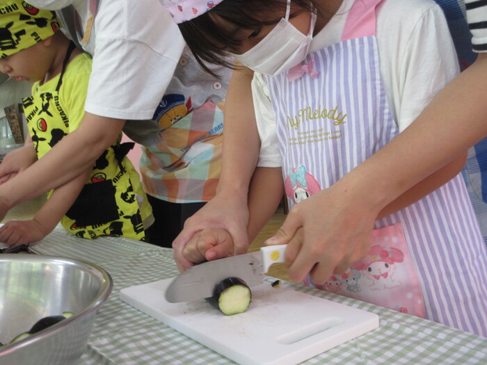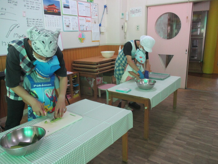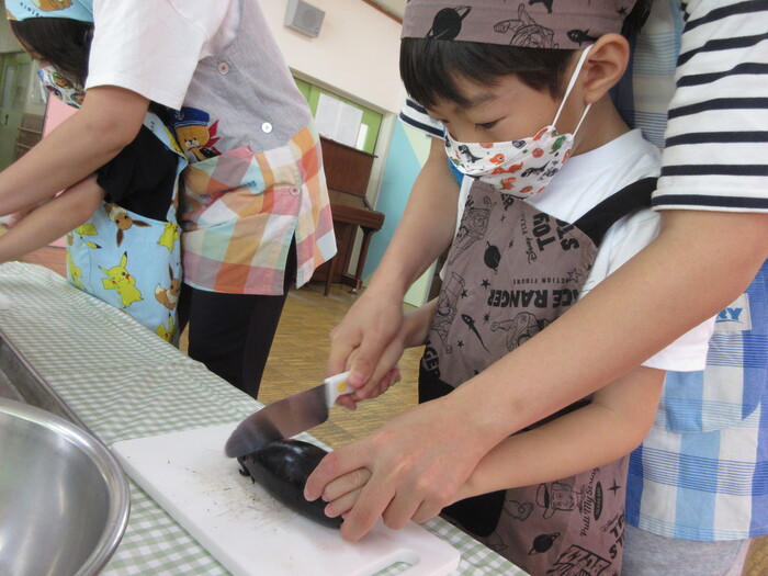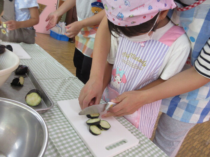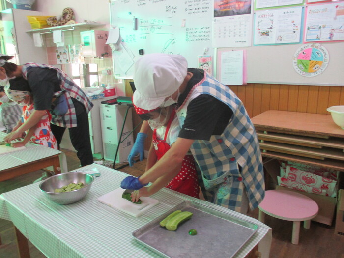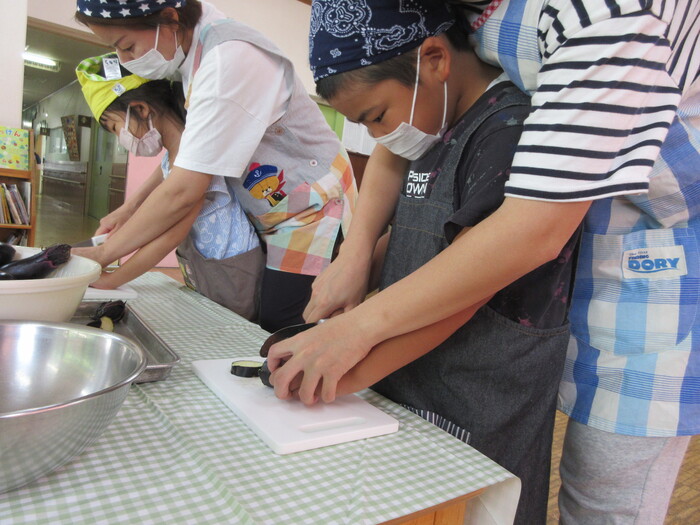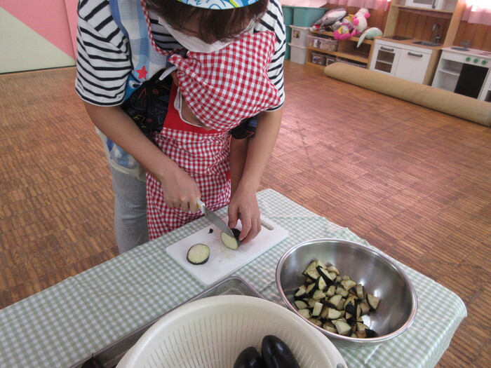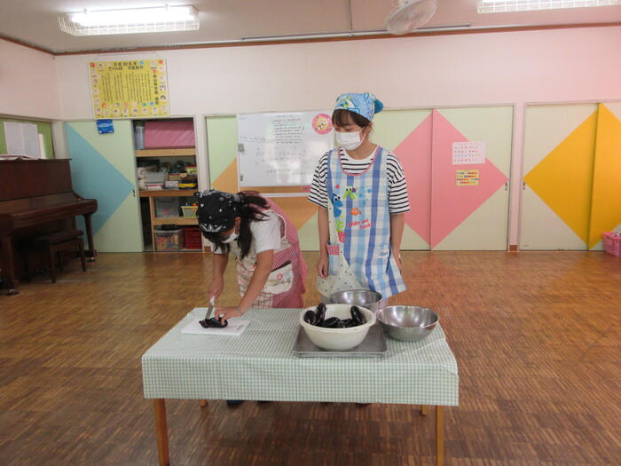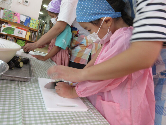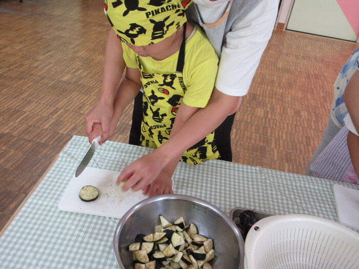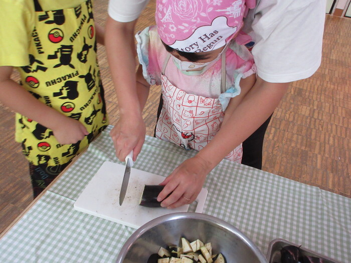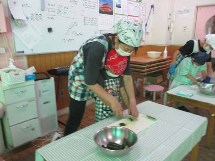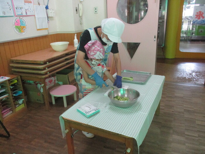 8月9日(金) クッキング (キュウリの塩もみ・ナスのカット) ~ うさぎぐみ ~ | ||