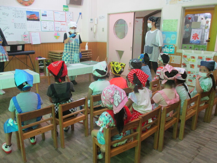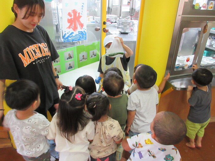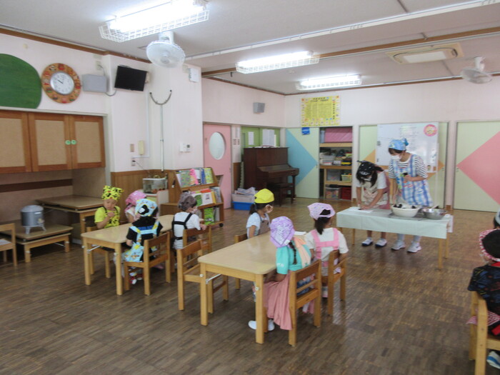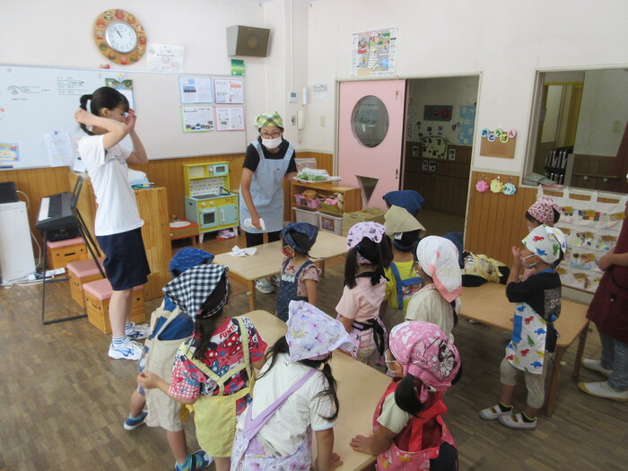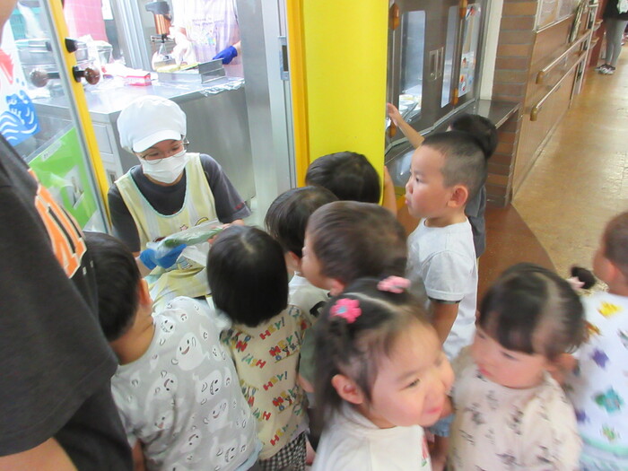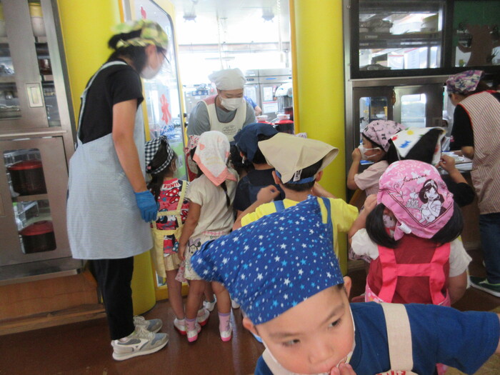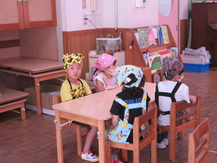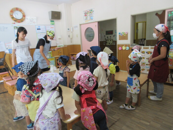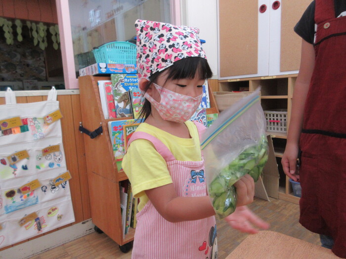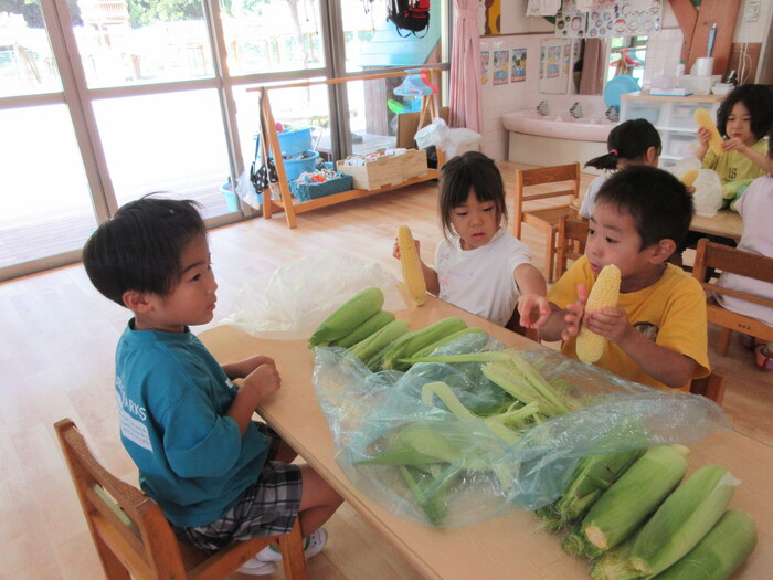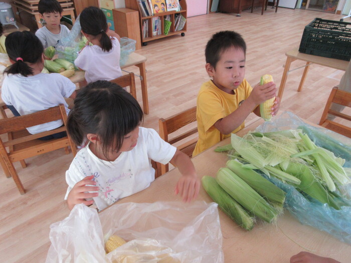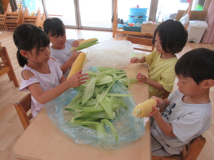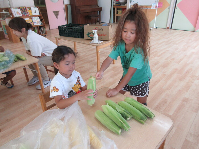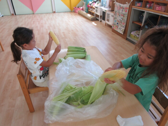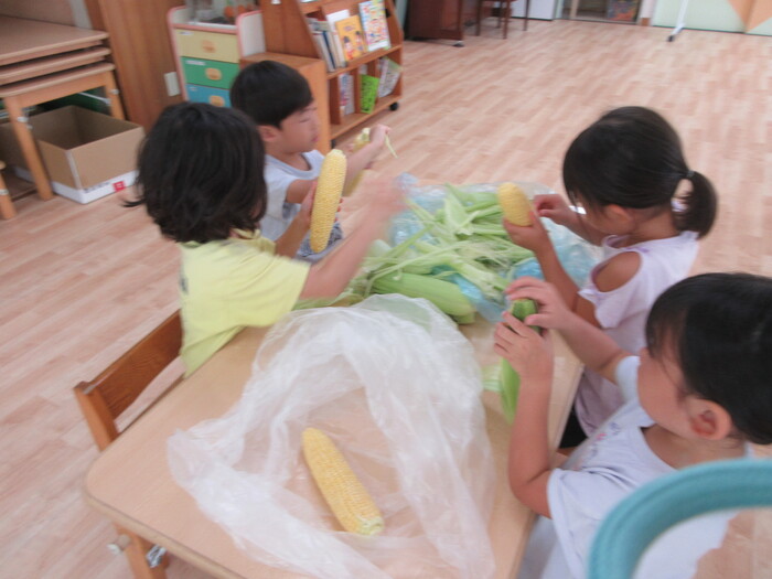 8月19日(月) 給食のお手伝い (トウモロコシの皮むき) ~ きりんぐみ ~ | ||