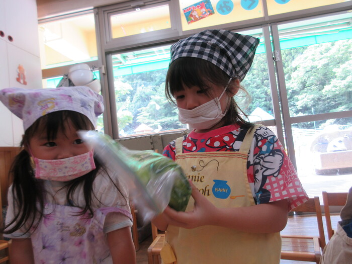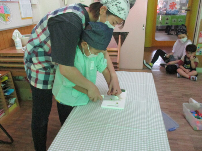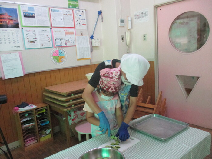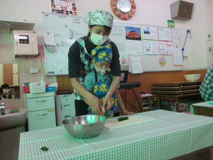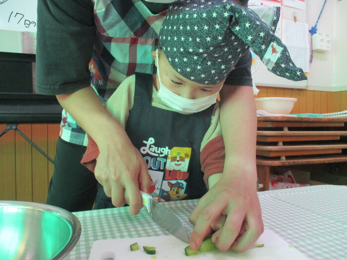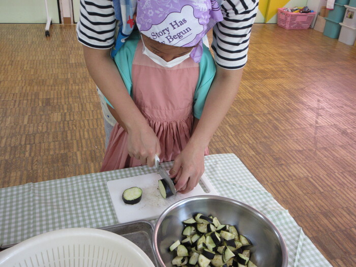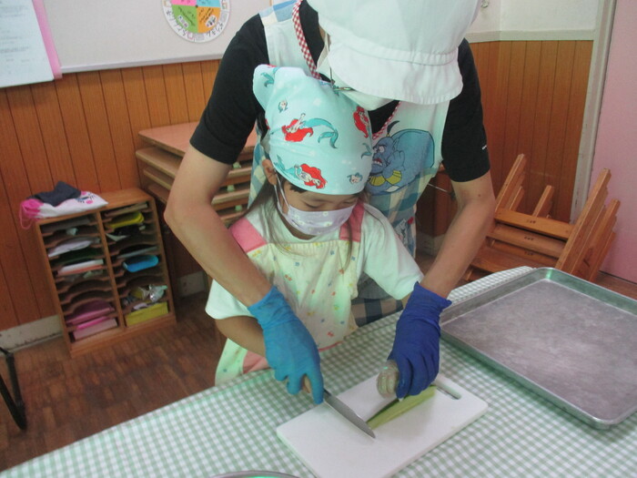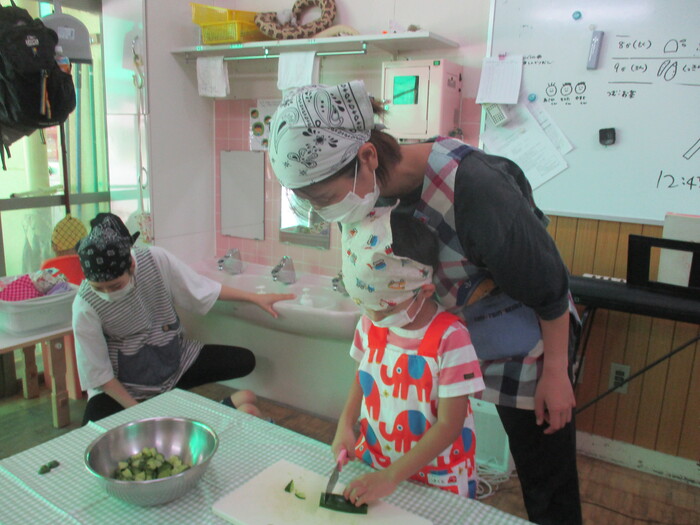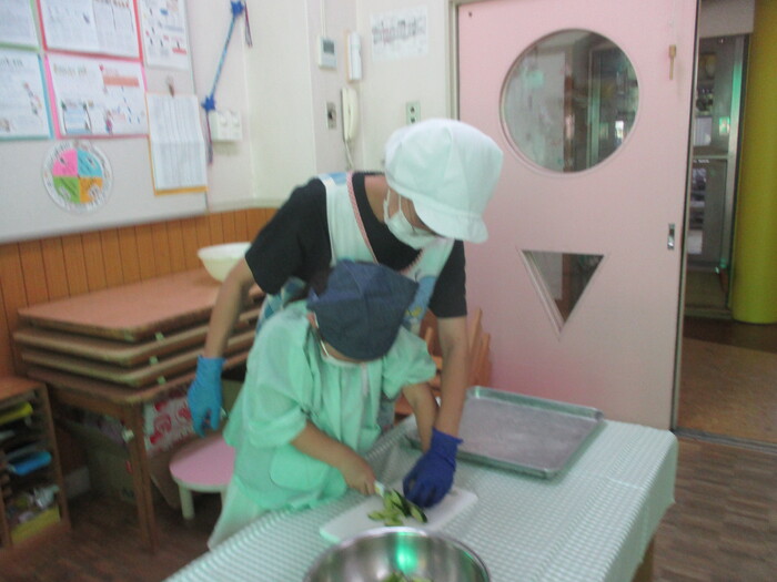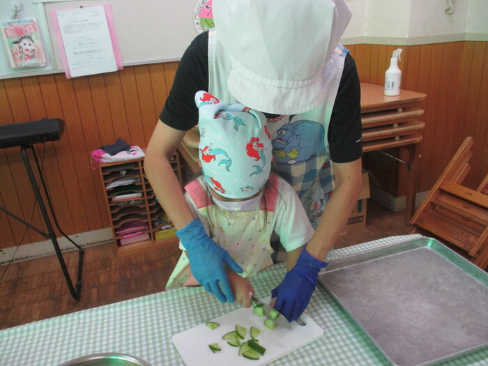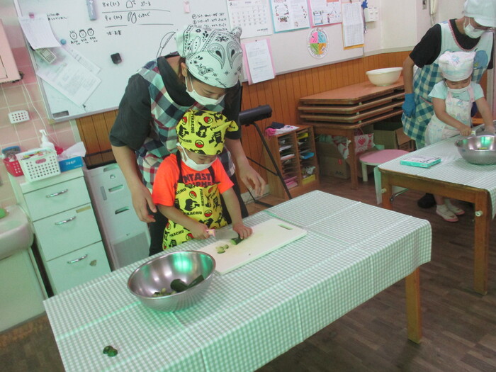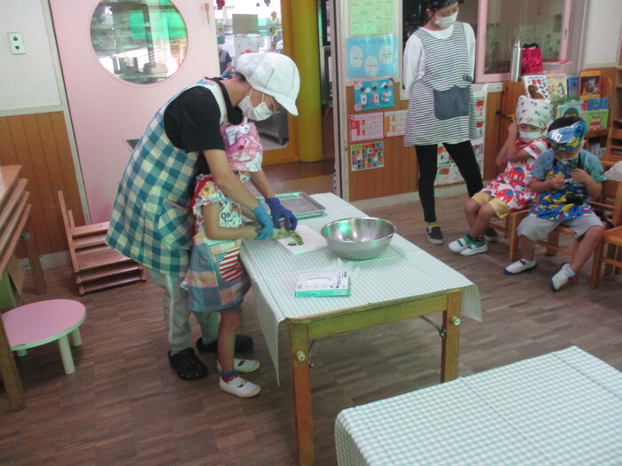 8月9日(金) クッキング (キュウリの塩もみ・ナスのカット) ~ きりんぐみ ~ | ||