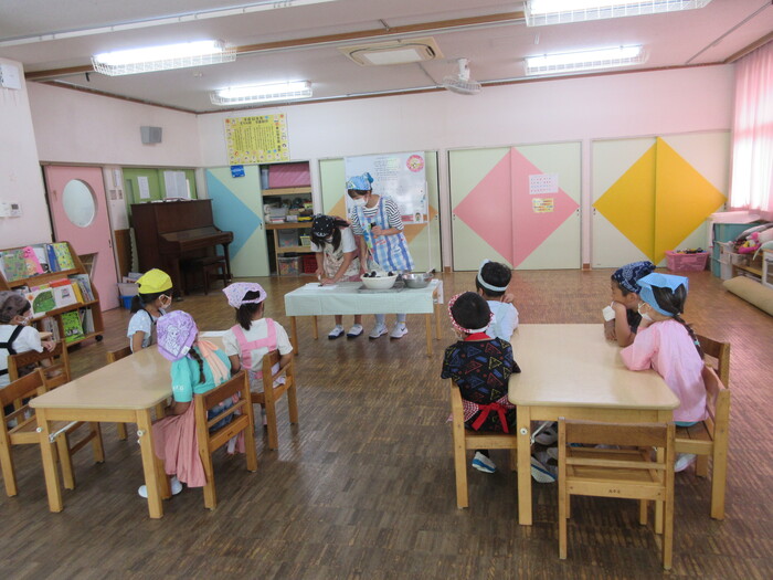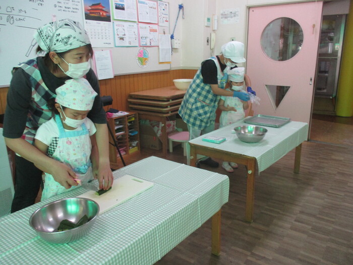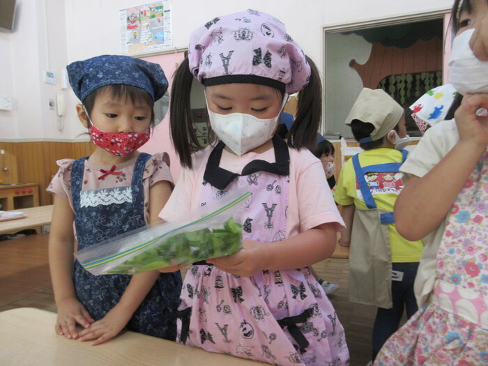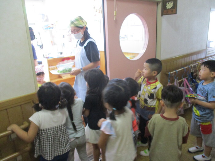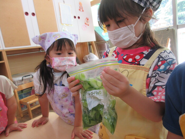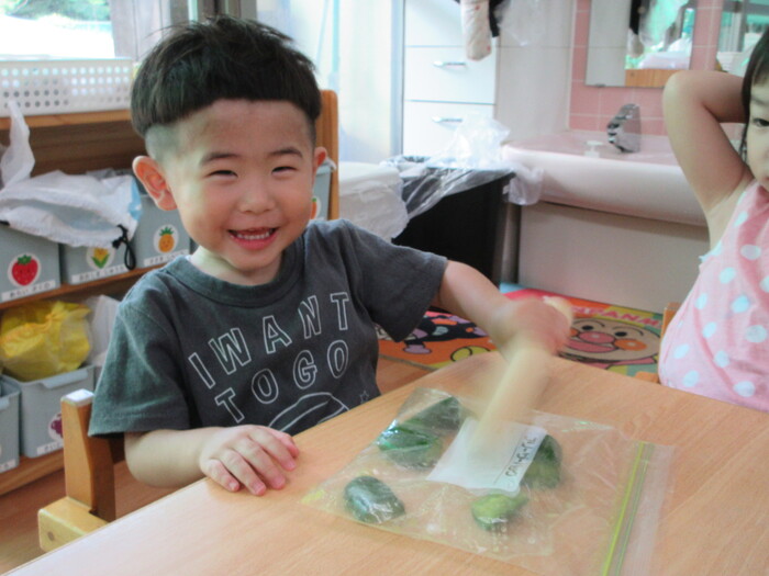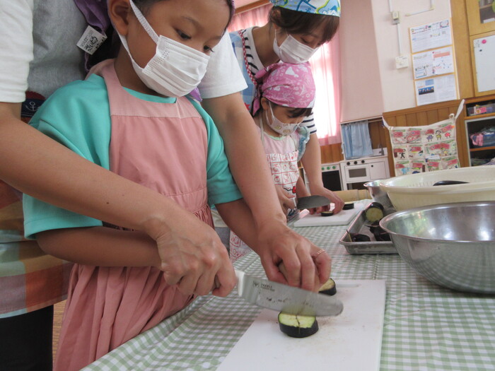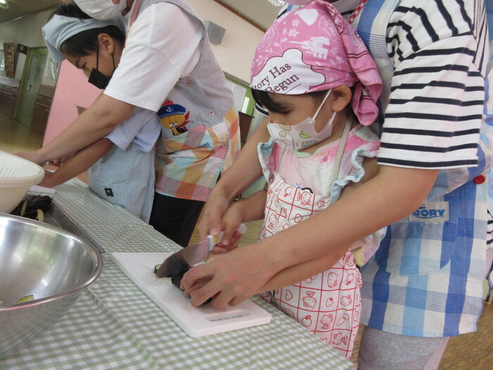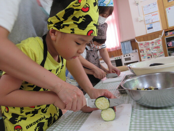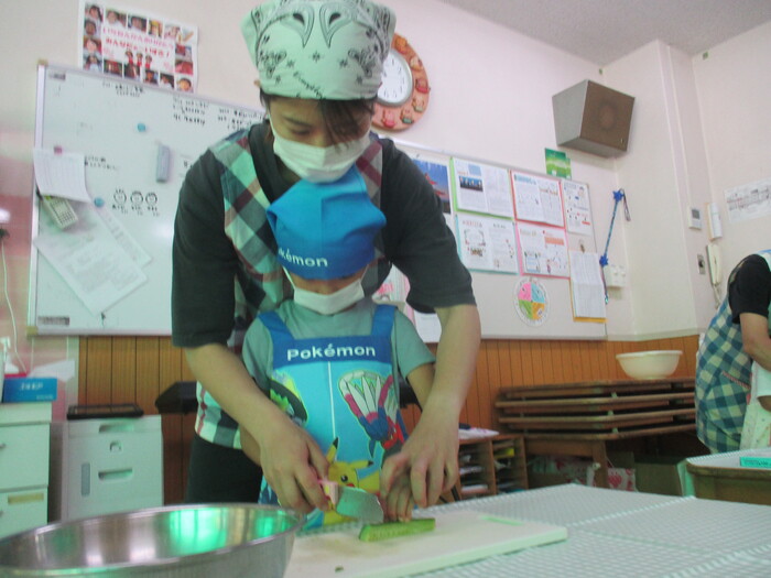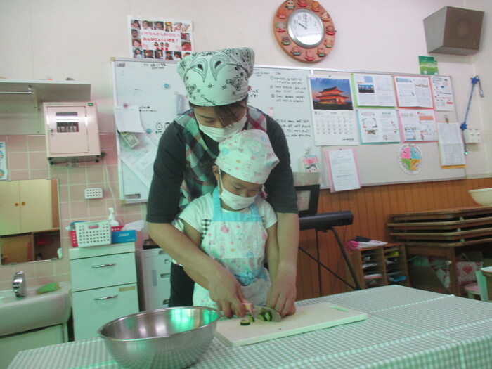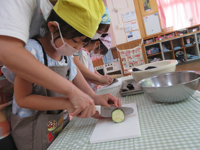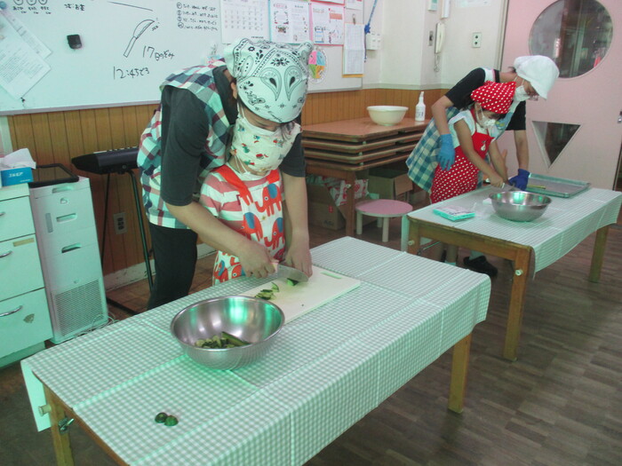 8月9日(金) クッキング (キュウリの塩もみ・ナスのカット) ~ きりんぐみ ~ | ||