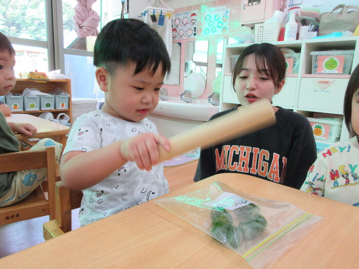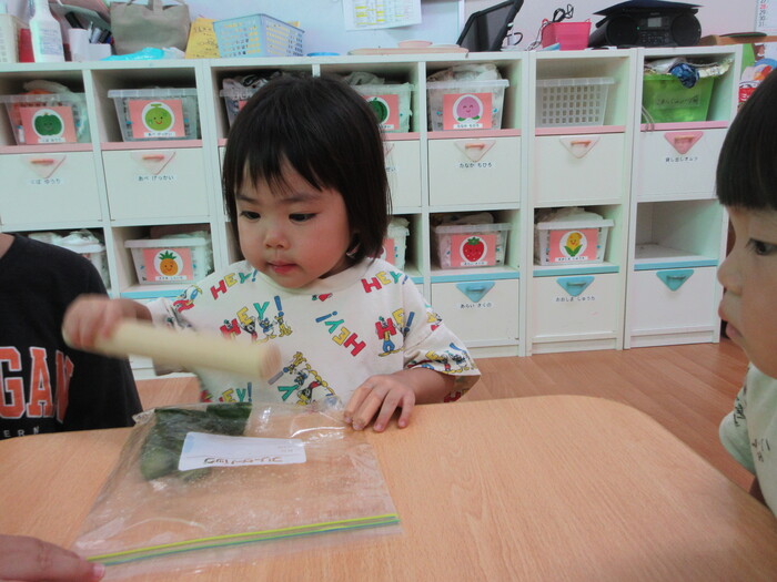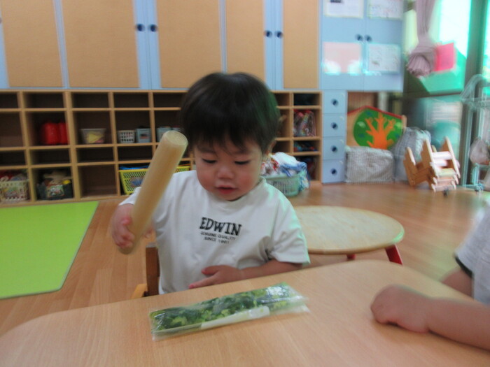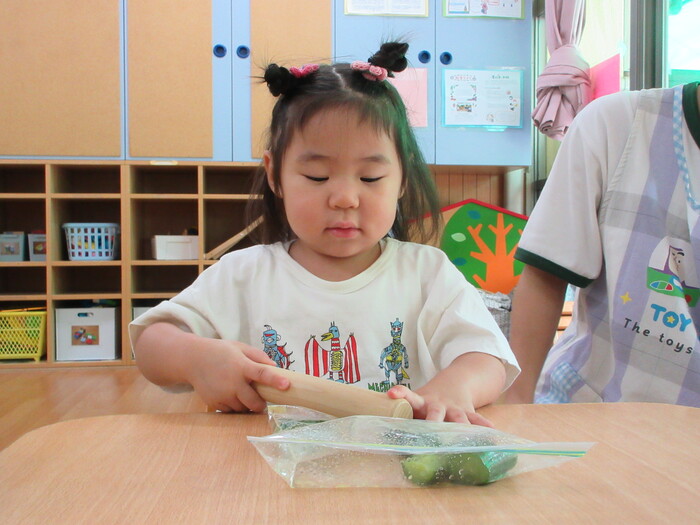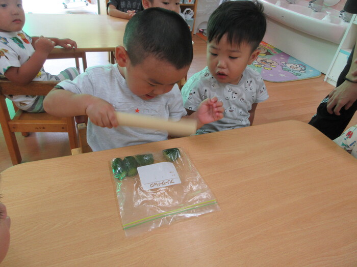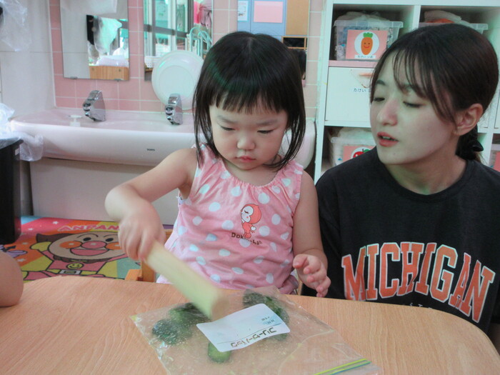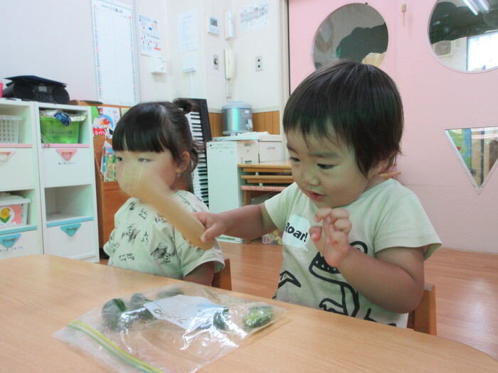 8月9日(金) クッキング (キュウリを麺棒で叩く作業) ~ こあらぐみ ~ | ||