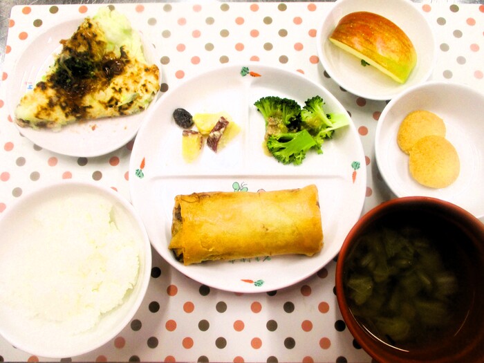 10月27日(月) <給食> ごはん きのこの中華スープ 春巻き ブロッコリーの肉味噌がけ さつまいもとレーズンのサラダ りんご <おやつ> 10時 ショートブレット 15時 お好み焼き | ||