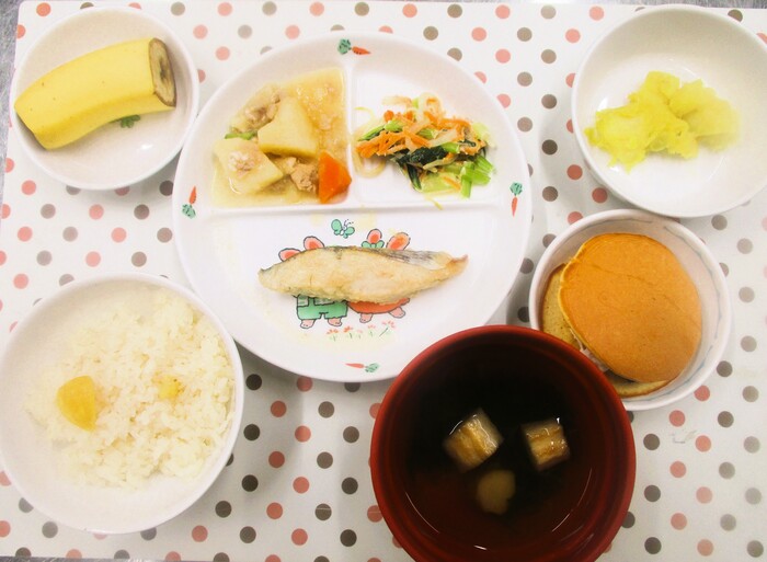10月29日(水) <給食> 栗ごはん 麩と水菜のすまし汁 鰆の西京焼き 肉じゃが 小松菜のおかかマヨ和え バナナ <おやつ> 10時 おさつバター 15時 あんホイップどら焼き | ||