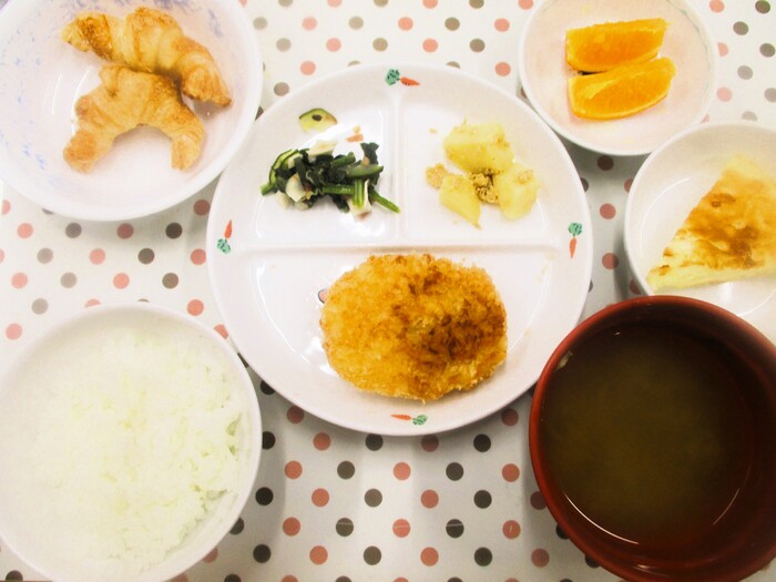 10月30日(木) <給食> ごはん あおさの味噌汁 カニクリームコロッケ じゃがいものカレーきんぴら きのこ梅サラダ オレンジ <おやつ> 10時 チーズパンケーキ 15時 ミニクロワッサン | ||