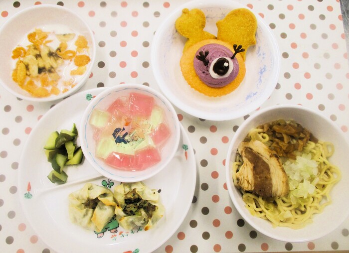 8月6日・20日(水) <給食> 梅風味塩ラーメン 焼き餃子 ブロッコリーとわかめのナムル オレンジ <おやつ> 10時 かぼちゃスコーン 15時 冷や汁 | ||