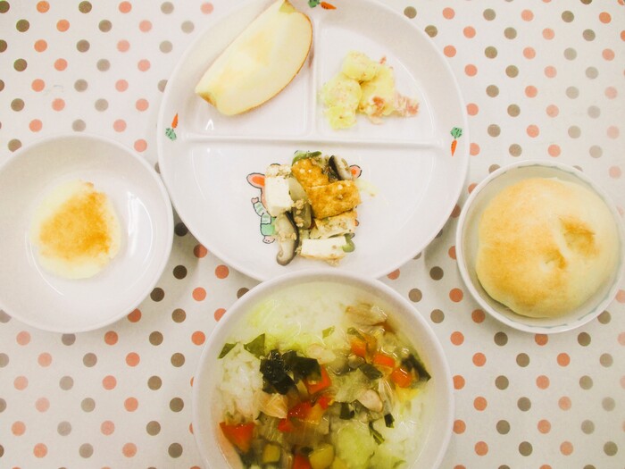 11月4日・18日(火) <給食> スープごはん 厚揚げのそぼろ炒め さつまいもとハムのごまサラダ りんご <おやつ> 10時 甘辛じゃがもち 15時 ツナフランス | ||
