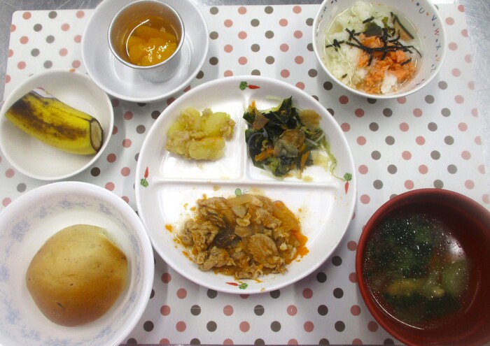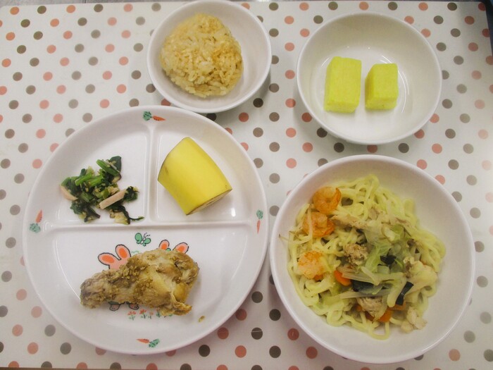 11月5日・19日(水) <給食> ちゃんぽん 鶏手羽元の甘辛醤油だれ 小松菜と椎茸の中華和え バナナ <おやつ> 10時 いもようかん 15時 焼きおにぎり | ||