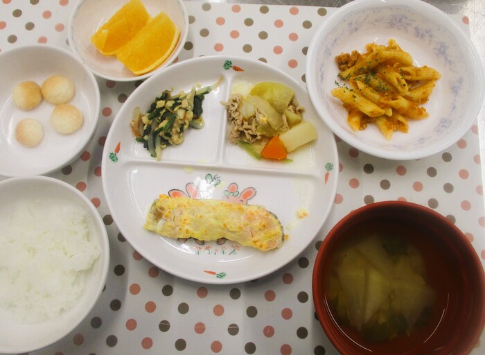 11月6日・20日(木) <給食> ごはん かぶとしめじの味噌汁 鮭の紅葉焼き 肉じゃが ほうれん草の納豆和え オレンジ <おやつ> 10時 ヨーグルトボーロ 15時 ペンネミート | ||
