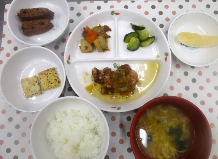 11月7日・21日(金) <給食> ごはん 中華風コーンスープ ユーリンチー 里芋と豚肉の炒めもの 中華きゅうり りんご <おやつ> 10時 黒ごまチーズクラッカー 15時 チョコビスコッティー | ||