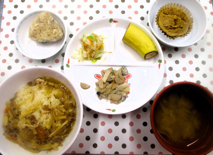 10月2日・16日(木) <給食> ごはん かぶのすまし汁 さばの味噌煮 チンゲン菜と鶏肉の中華炒め 大根の磯和え バナナ <おやつ> 10時 菜飯おにぎり 15時 おやつカレーパン | ||