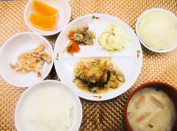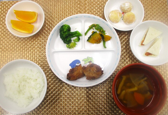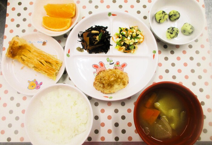 11月11日・25日(火) <給食> ごはん さつまいもの豆乳汁 和風きのこハンバーグ れんこんのきんぴら りんご入りグリーンサラダ オレンジ <おやつ> 10時 うどんかりんとう 15時 肉まん | ||