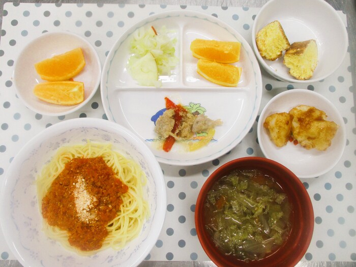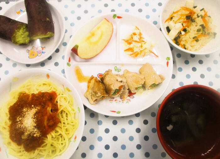11月12日・26日(水) <給食> ミートソーススパゲティ なすとベーコンのスープ 野菜の肉巻き キャベツのコールスロー りんご <おやつ> 10時 豆腐雑炊 15時 焼きいも | ||