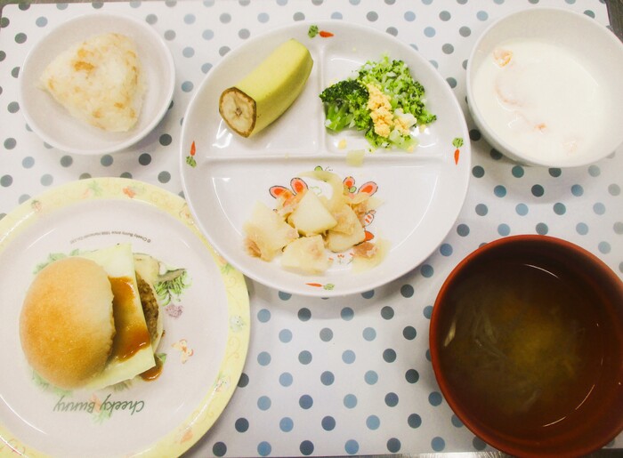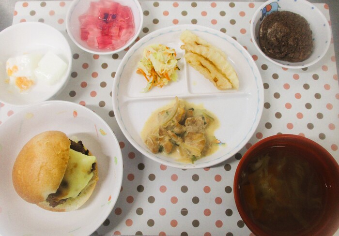 11月13日・27日(木) <給食> 手作りチーズバーガー マカロニスープ ジャーマンポテト ブロッコリーのミモザサラダ バナナ <おやつ> 10時 みかんヨーグルト 15時 大根そぼろおにぎり | ||