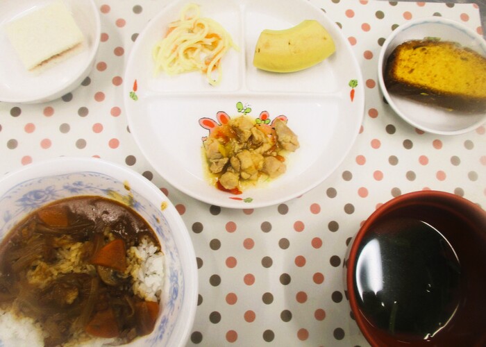 6月5日・19日(木) <給食> トマトチキンカレー(胚芽米) キャベツのコンソメスープ 春雨と卵の炒め物 コロコロマリネ オレンジ <おやつ> 10時 バナナケーキ 15時 キャラメルラスク | ||
