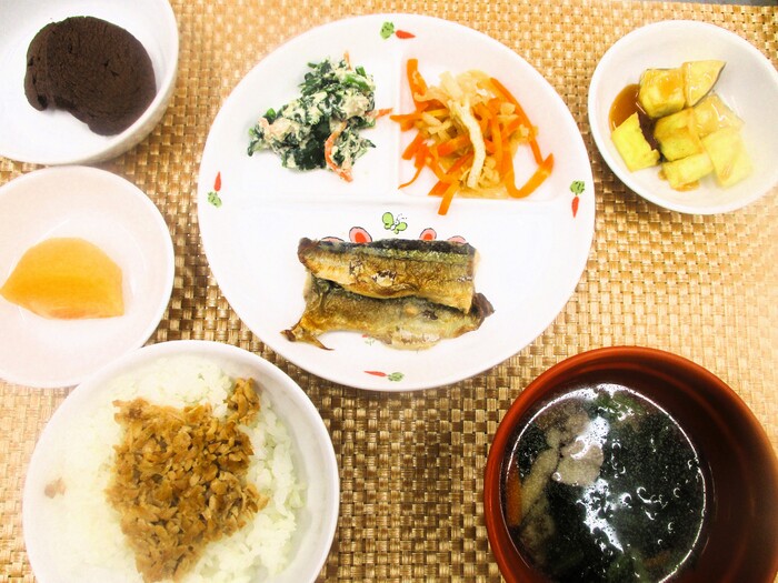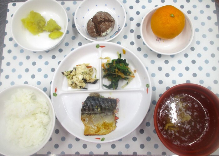 11月17日(月) <給食> 納豆ごはん(胚芽米) 豚ばら入り沢煮 さんまに塩焼き 切り干し大根の煮物 青菜の白和え 柿 <おやつ> 10時 ココアクッキー 15時 さつまいもキャラメル | ||