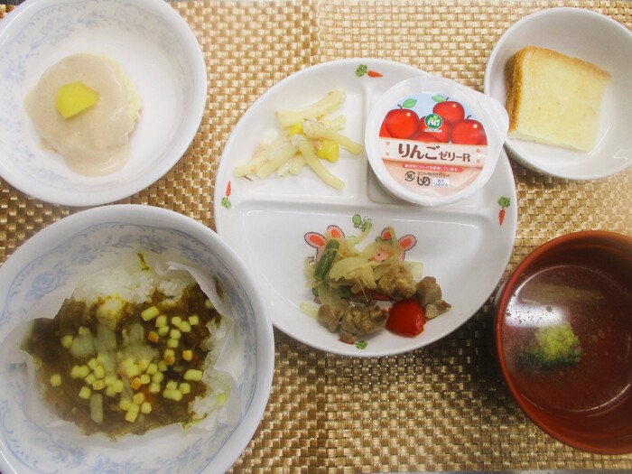 9月8日・22日(月) <給食> まめまめドライカレー チキンスープ じゃがいものガーリックマヨ炒め ツナとレモンのコールスロー オレンジ <おやつ> 10時 米粉のパンケーキ 15時 チョコチップクッキー | ||