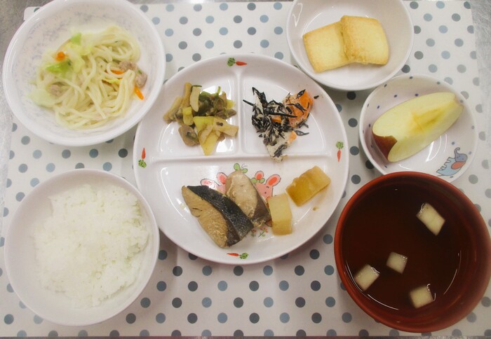 12月1日・15日(月) <給食> ごはん はんぺんのすまし汁 ぶり大根 さつまいもときのこの炒め物 れんこんとひじきの和風サラダ りんご <おやつ> 10時 ショートブレット 15時 おやつ塩やきそば | ||