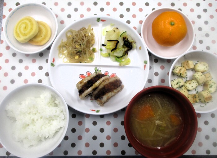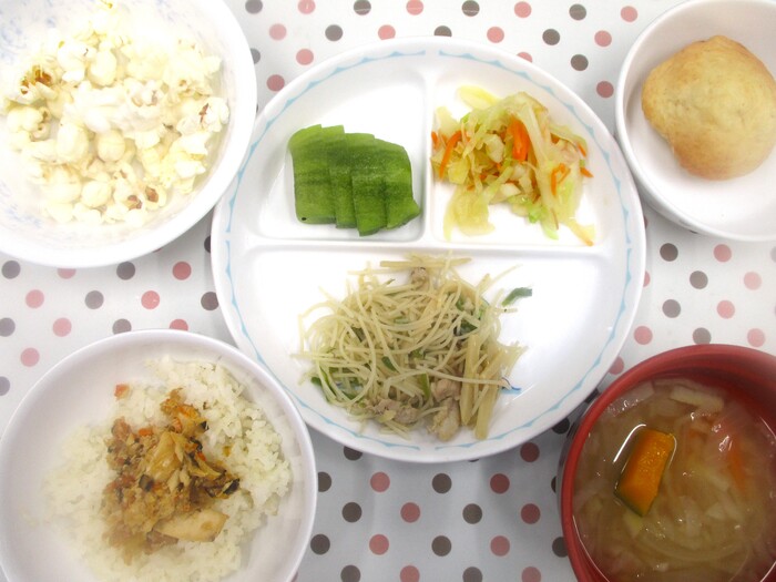 4月4日・18日(金) <給食> ごはん ふきと油揚げの味噌汁 キャベツメンチ さつまいものバター醤油炒め 白菜のなめ茸和え キウイフルーツ <おやつ> 10時 牛乳 ジャムサンド 15時 牛乳 ポップコーン | ||