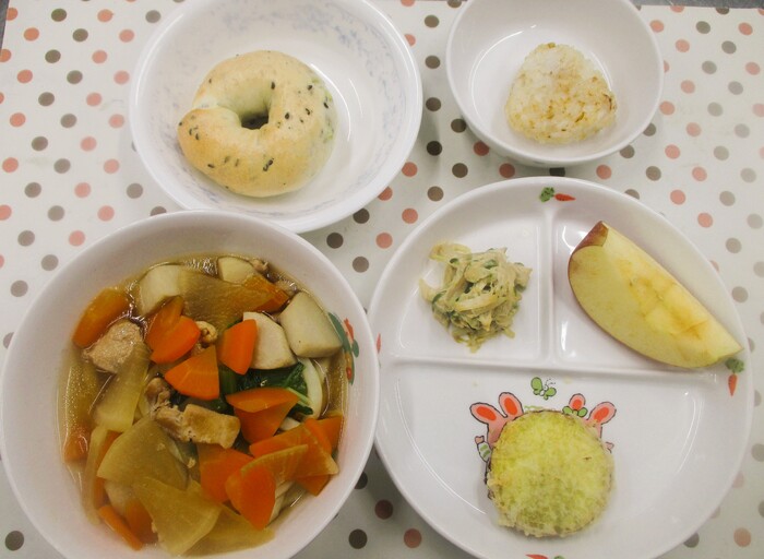 12月4日・18日(木) <給食> けんちんうんどん さつまいもの天ぷら バンバンジーサラダ りんご <おやつ> 10時 おかかおにぎり 15時 アップルパイ | ||