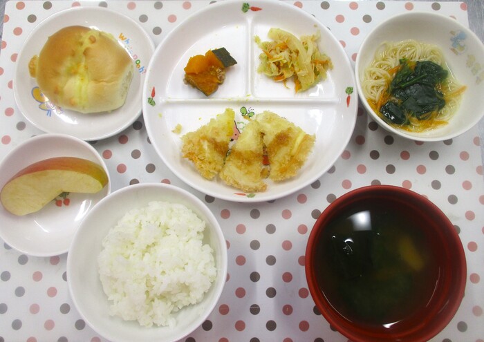 12月8日・22日(月) <給食> ごはん 舞茸とごぼうの味噌汁 はんぺんチーズフライ かぼちゃのそぼろあんかけ キャベツのごま和え りんご <おやつ> 10時 にゅうめん 15時 ポテマヨパン | ||