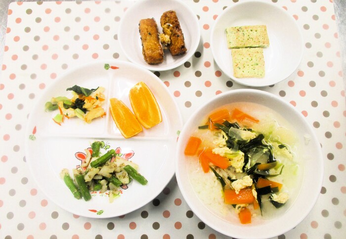 4月7日・21日(月) <給食> ごはん 豆腐とわかめの味噌汁 豚肉のプルコギ炒め かぼちゃのそぼろあんかけ 小松菜としらすの磯和え オレンジ <おやつ> 10時 さつまいもボーロ 15時 かりんとうドーナツ | ||