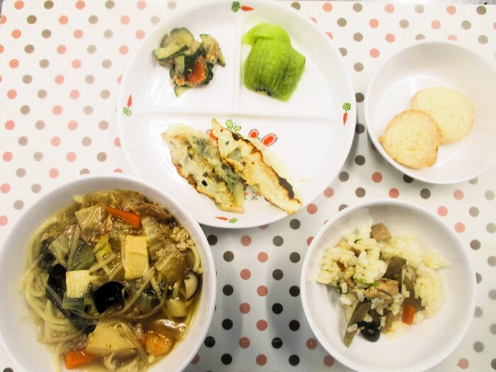 12月10日(水) <給食> あんかけラーメン 焼き餃子 きゅうりとじゃこの中華和え キウイ <おやつ> 10時 バナナクッキー 15時 鶏五目ごはん | ||