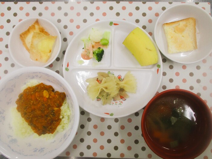 12月11日・25日(木) <給食> まめまめドライカレー(胚芽米) 大麦スープ リボンパスタのバジルソテー 花野菜のオーロラソースがけ バナナ <おやつ> 10時 メロンパン風トースト 15時 チーズの包み揚げ | ||
