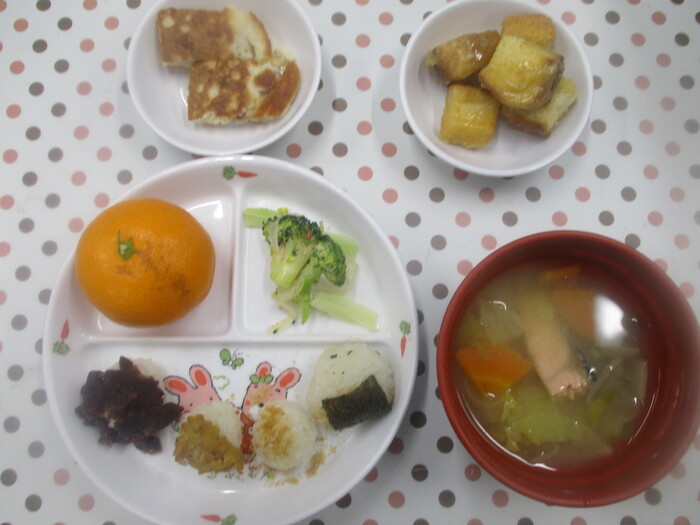 12月19日(金) <給食> ころころもち (磯部・納豆・きな粉・あんこ) 石狩汁 ブロッコリーのたらマヨサラダ みかん <おやつ> 10時 ジャムパンケーキ 15時 キャラメルラスク | ||