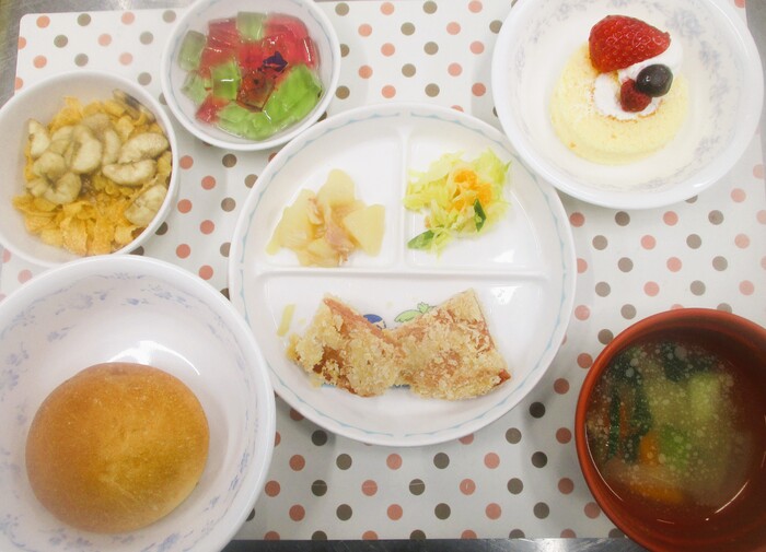 4月30日(水)~誕生会🎂~ <給食> 手作りパン BLTスープ 照り焼きハンバーグ フライドポテト スパゲティーのマヨポンサラダ 二色ゼリー <おやつ> 10時 おかかおにぎり 15時 誕生日ケーキ🍰 | ||