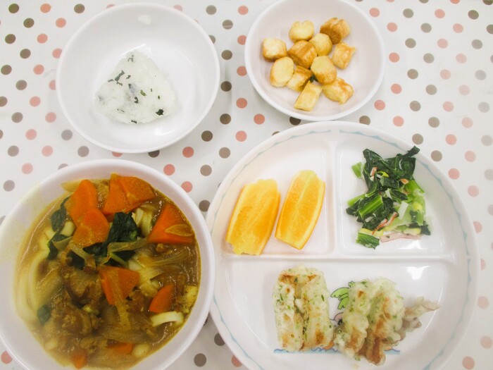 3月2日(月) <給食> カレーうどん ちくわの磯辺揚げ カニカマと青菜の三色和え オレンジ <おやつ> 10時 わかめおにぎり 15時 おふスナック | ||