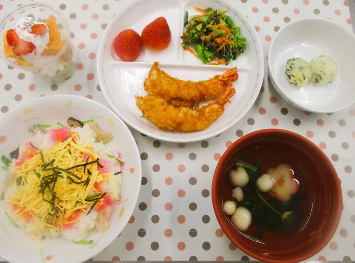 3月3日(火) <給食> ちらし寿司 花麩のすまし汁 えびフライ 菜の花のごま和え いちご <おやつ> 10時 じゃが丸 15時 ひな祭りパフェ | ||