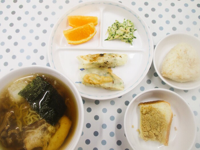 3月12日(木) <給食> 八王子ラーメン 焼き餃子 バンバンジーサラダ オレンジ <おやつ> 10時 すりごまトースト 15時 大根そぼろおにぎり | ||