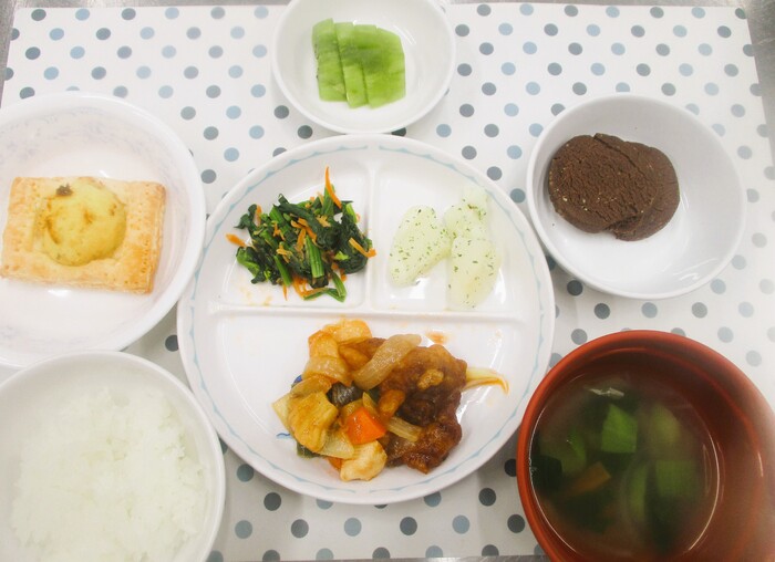 3月13日(金) <給食> ごはん 春雨中華スープ 酢豚 チーズ粉ふきいも キウイフルーツ <おやつ> 10時 ココアクッキー 15時 スイートポテトパイ | ||