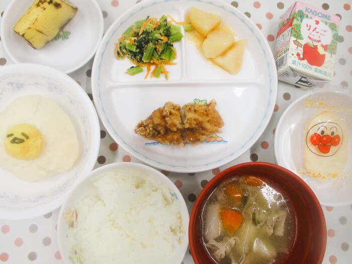 3月17日(火) <給食> ごはん 豚汁 鶏のから揚げ じゃがいもの煮っころがし 小松菜とコーンの和え物 バナナ <おやつ> 10時 りんごジュース おせんべい 15時 ぐでたまパン | ||