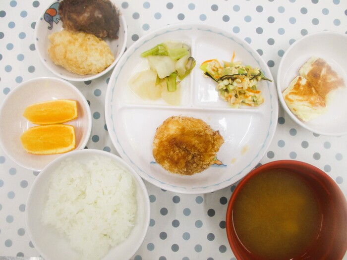 9月2日・16日(火) <給食> ごはん なめこの味噌汁 れんこんのはさみ揚げ なすとゴーヤのごま炒め ひじきの和風サラダ オレンジ <おやつ> 10時 チーズ蒸しパン 15時 わかめスパゲティー | ||
