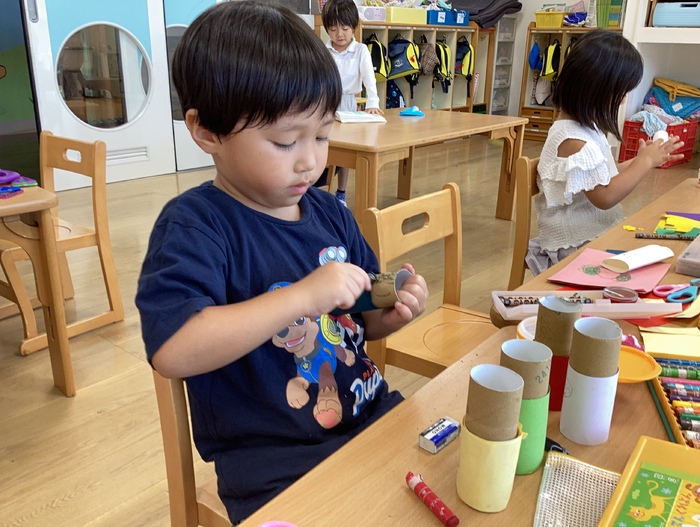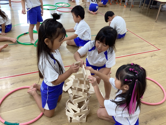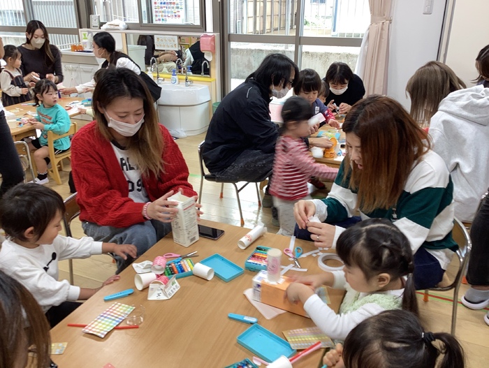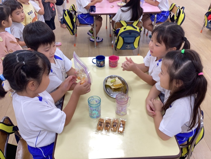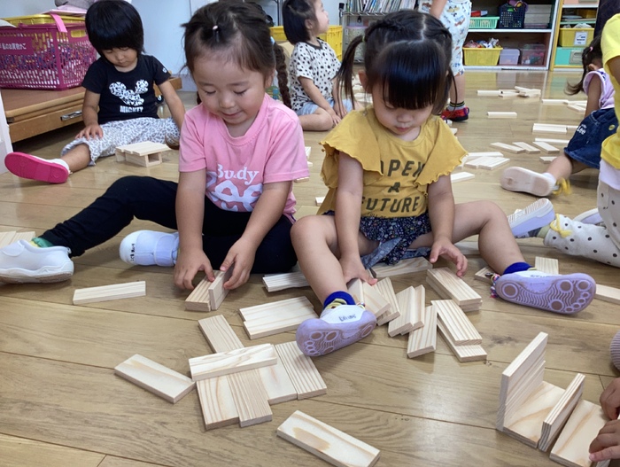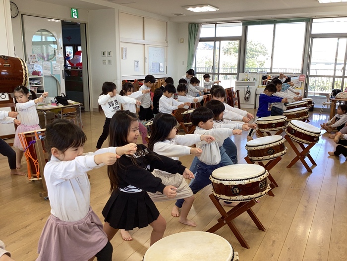 以前作ったピザづくりに続き おやつの時間に「にぎにぎじゅーす」を作りました! 自分達で作って食べて 特別感が増しますね🤭 未来っこで学んだかまぼこ板を使った遊びで友だちと協力‼ 積むだけでなく ドミノにして遊んだり様々な遊びへ変化させる さすがなばら組さんです🌹 すみれ組のお友だちへ和太鼓の叩き方を教えてくれたり お兄さんお姉さんな姿も見せてくれました✨ | ||