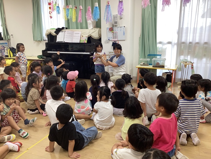 「山の音楽家」の歌に登場するフルート どんな楽器なのかな?実際に楽器を見たり 音色を聞いてから製作活動に活かしました♪ 「実物を見ながら絵を描くのって難しいなあ」 悩みながらも頑張るすみれ組の子どもたち。 様々な体験を通して学びに繋げることが できました😊 | ||