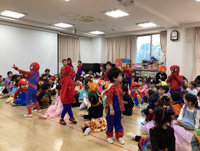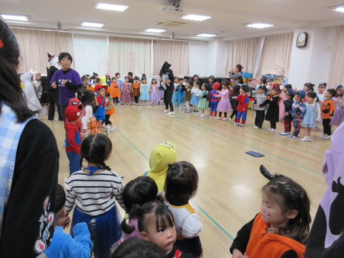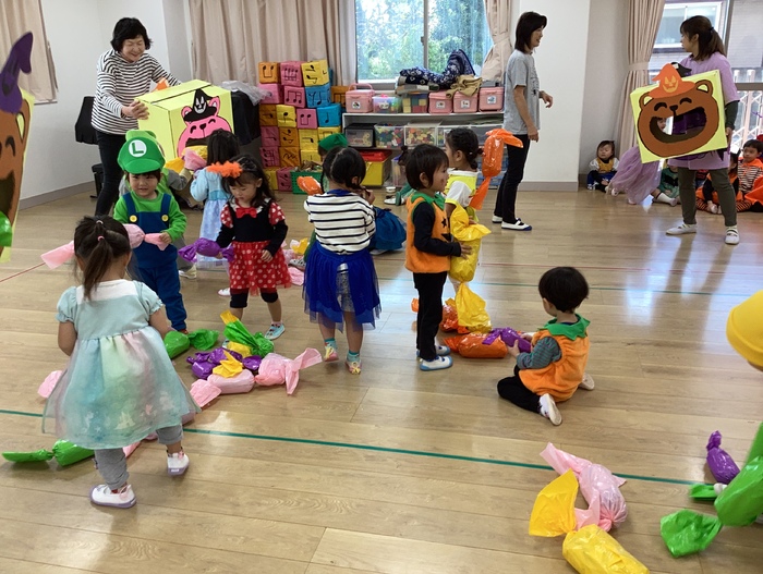 「トリックオアトリート~!」 好きなキャラクターやおばけに変身👻🌟 いろんな仮装の子どもたち・・・とってもかわいいです! ダンスや大きなお菓子を使ったゲームもして楽しいハロウィンパーティーになりました🍭 | ||
