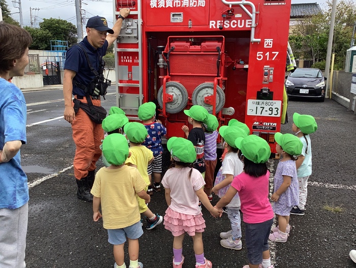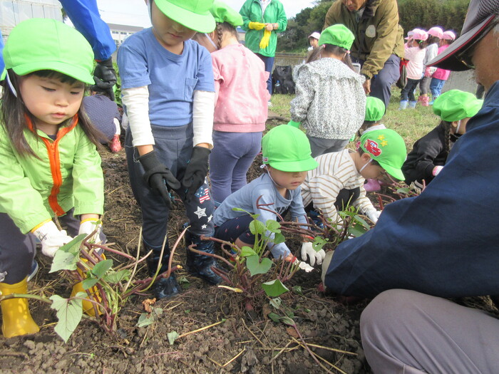 防災の日では消防車の見学をしました。こんな近くにかっこいい消防車が・・・🚒✨ 興味津々のたんぽぽ組です! 未来っこで取り組んだ かまぼこ板遊びではすごい集中力で積み上げていました 初めてのお芋ほりに挑戦!長靴を履いて軍手をして準備ばっちりです👍 サツマイモが埋まっていることにびっくりしている子もいました🍠 | ||