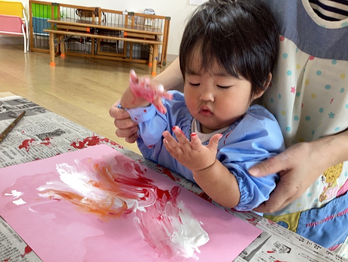涼しくなってきたのでたくさんお散歩に行きました🎵 冨浦公園では砂浜に降りて海を見ました。波の音を聞いたり、貝殻を拾ったり・・・ 長井ならではお散歩を楽しんだつぼみ組さんです! 製作では久しぶりにフィンガーペイントに挑戦!絵具の感触にも慣れ おててを大きく動かしてたくさんぬりぬり✋ かわいい製作になりました💕 | ||
